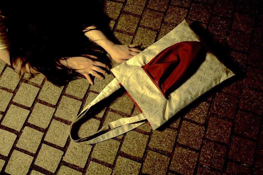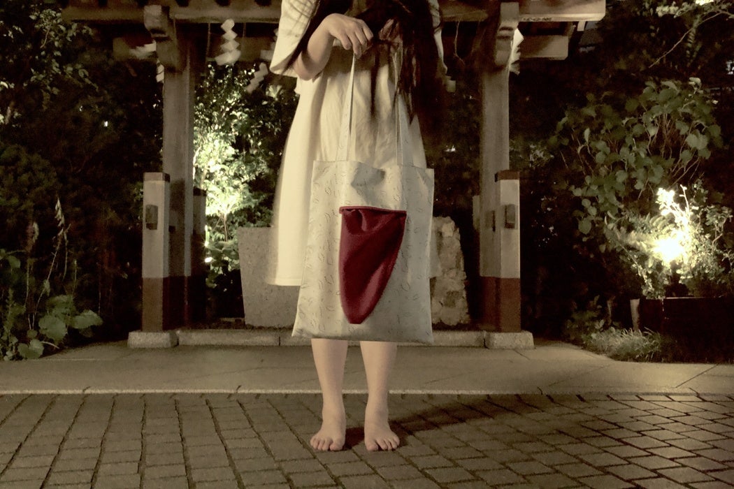 大きな口でけらけらと笑う妖怪・お歯黒べったり柄の織物生地で作ったトートバックです。