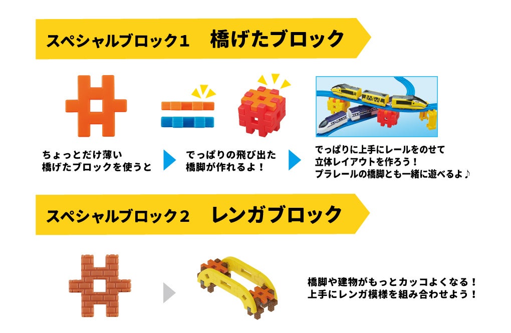 いずれもプラレールとより楽しく遊ぶためのスペシャルブロック入りで、橋げたブロックはプラレールの橋脚の代わりにも使えます。レンガブロックは、かっこいい建造物をつくるのにピッタリです!