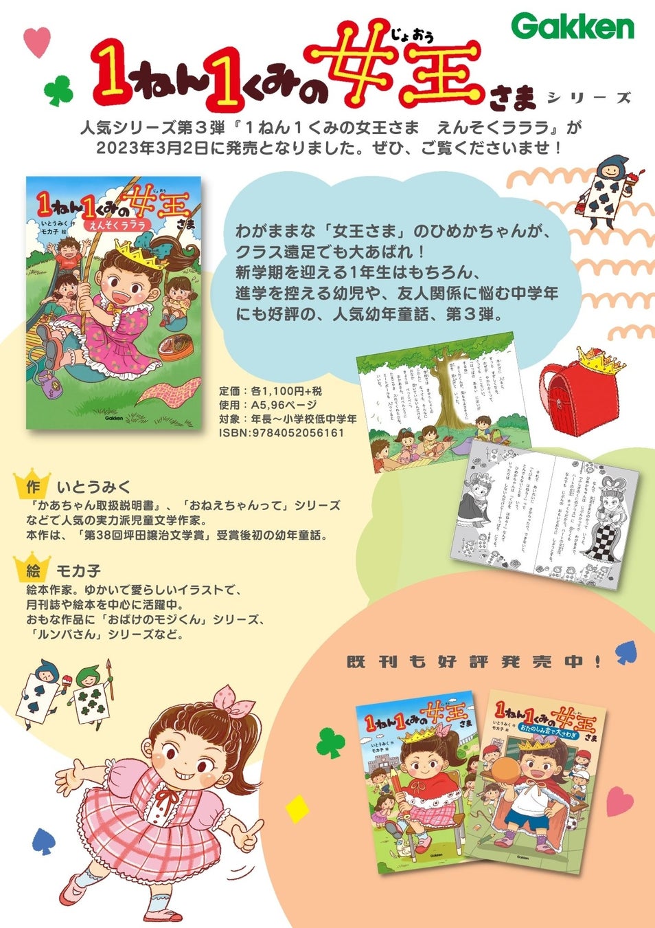 株式会社 学研ホールディングス(東京・品川/代表取締役社長:宮原博昭)のグループ会社、株式会社 Gakken(東京・品川/代表取締役社長:五郎丸徹)は、2023年3月2日(木)に、児童向け読み物『1ねん1くみの女王さま えんそくラララ』を発売いたしました。