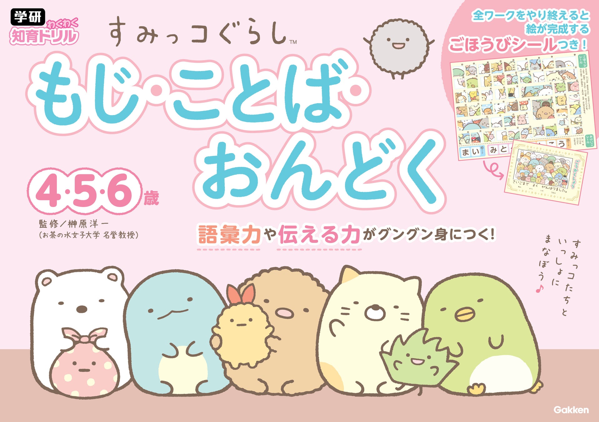 大人気キャラクター“すみっコぐらし”と一緒に、文字や言葉の“読み・書き“、短い文章を読む”音読“が学べる、4~6歳児向けのドリルです。