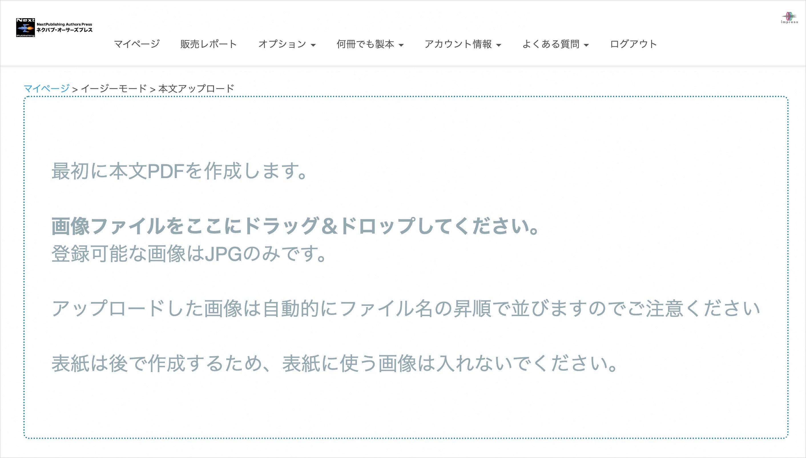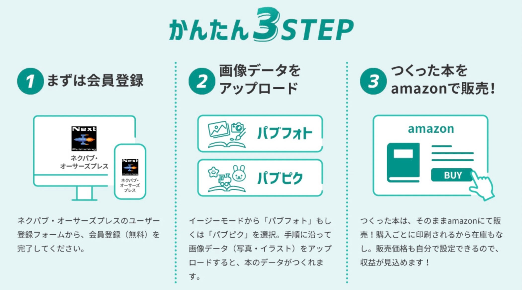 今回、ネクパブの新機能として提供開始した[イージーモード]は、掲載したい画像ファイル(当面はjpeg形式のみ対応)を順番に並べてアップロードするだけで、1ページあたり1枚の画像が掲載された本としてamazonで販売することができます。選択できる本のタイプは、「パブフォト(写真集・イラスト集向け)」「パブピク(絵本向け)」「パブコミ(コミック向け)」です。なお、基本利用料は無料です。