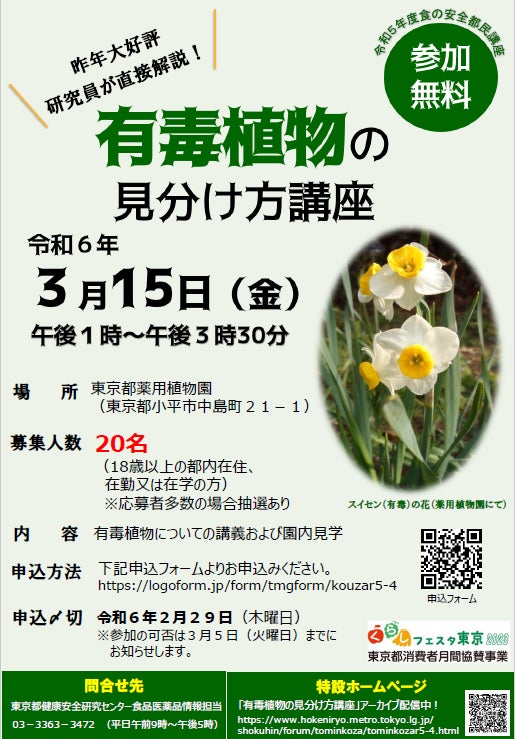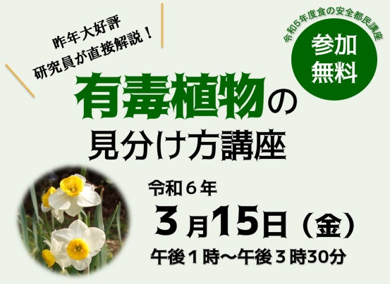 今回の講座では、ニラに似ているスイセンの葉のように、「間違えて食べると食中毒を起こす有毒植物」について、実際の植物を紹介しながら、その見分け方等を東京都薬用植物園の主任研究員が分かりやすく解説します。