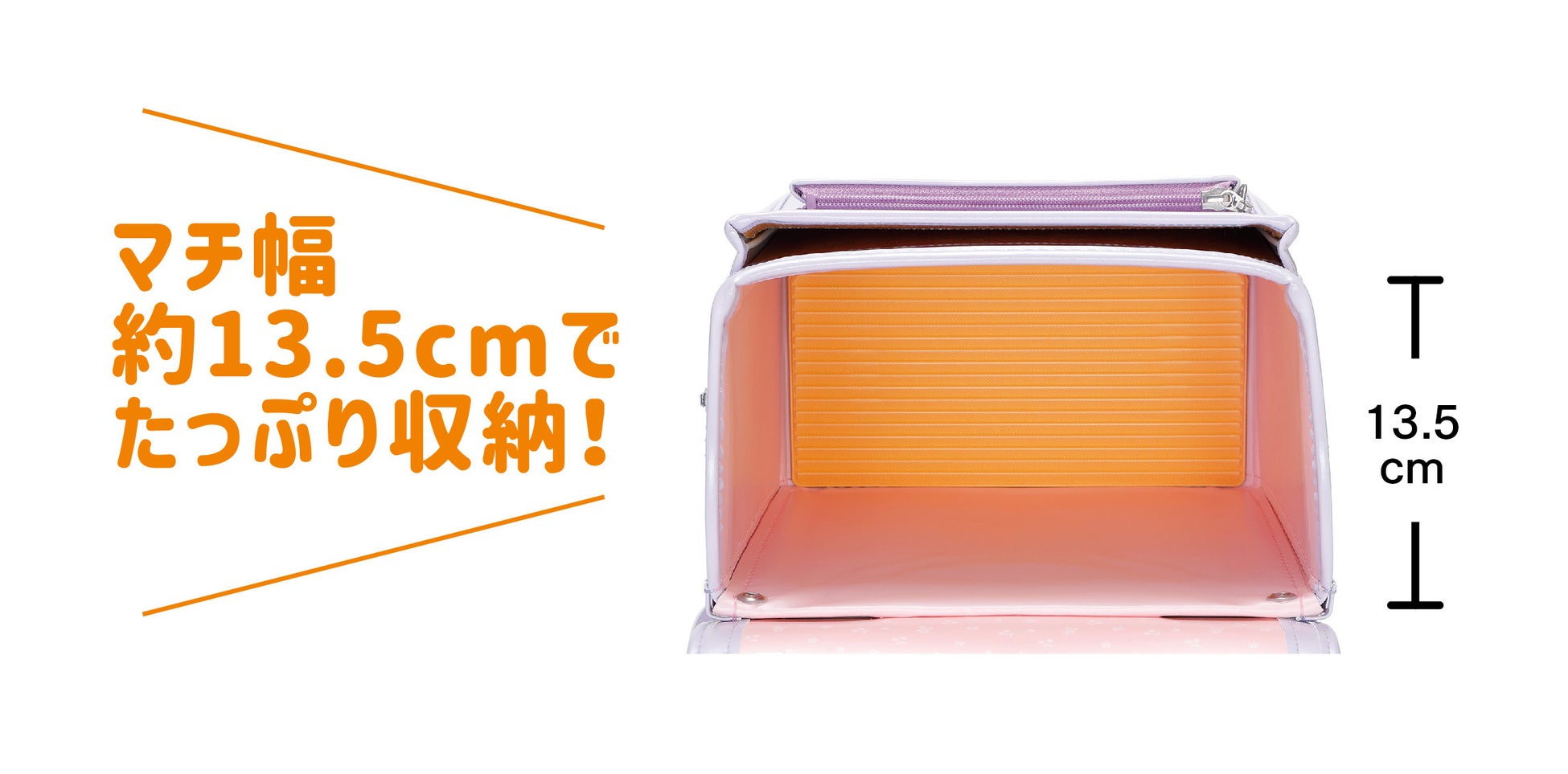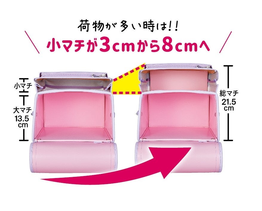 小マチが3cmから8cmへ伸び、荷物量に合わせて拡縮が可能です。大マチ13.5cmと合わせて総マチ最大21.5cmあり、かるすぽ最大容量です。しっかり収納でき、手荷物なしの安全で安心な通学をサポートします。