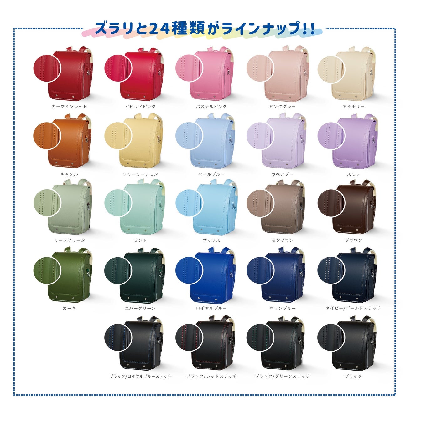 24種類の「はなまるランドセル24」は、トレンドに応じ、3色入れかえています。さらに「はな