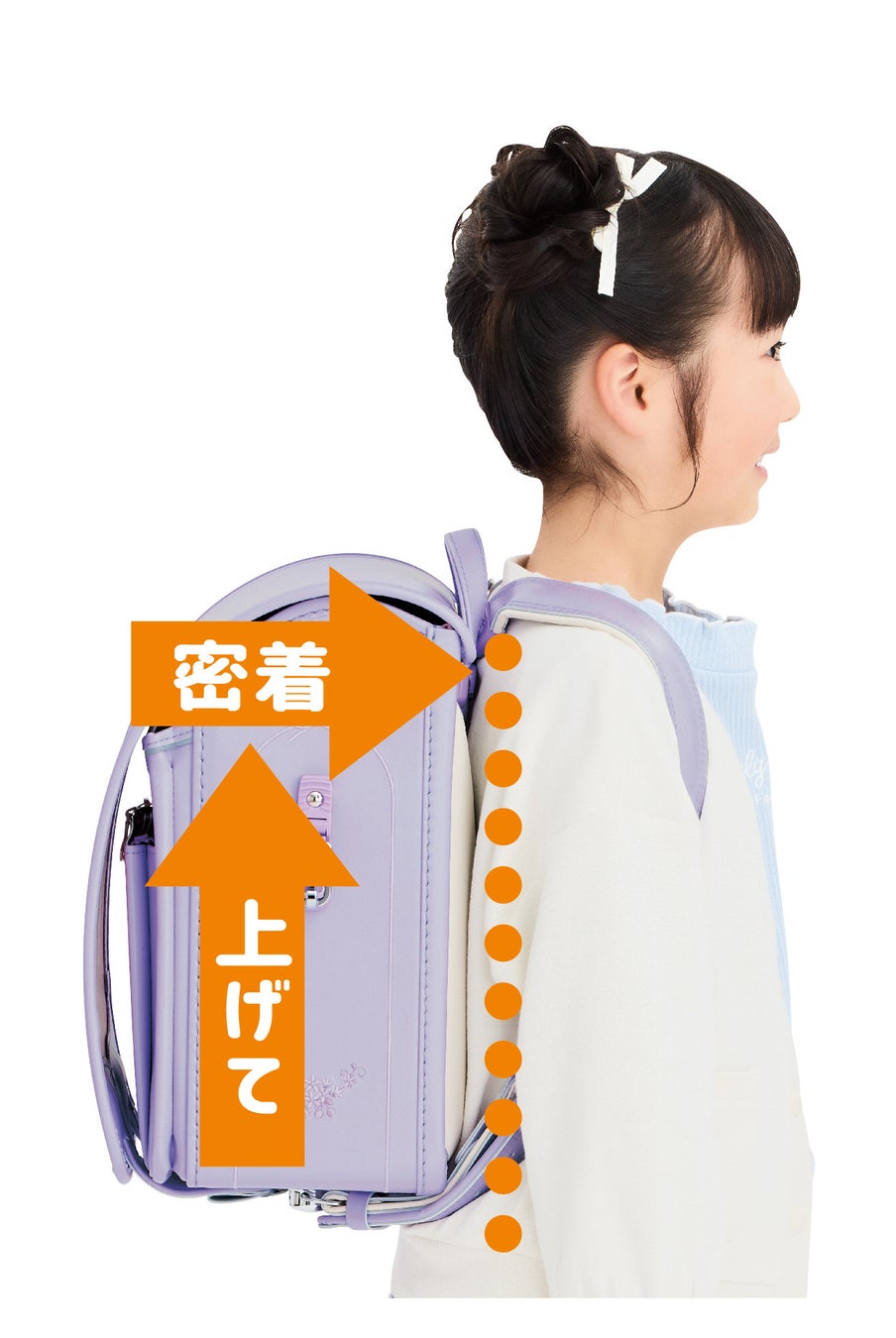 株式会社セイバンと共同開発した背おいやすさにこだわったランドセルです。左右連動背カンや、背あてと肩ベルトに低反発スポンジを搭載しています。背中や肩への密着面積を大きくすることで、からだへの負荷を小さくし、自然な姿勢でかるがる背おえます。マチ幅も約13.5cmあり、たっぷり収納できます。
