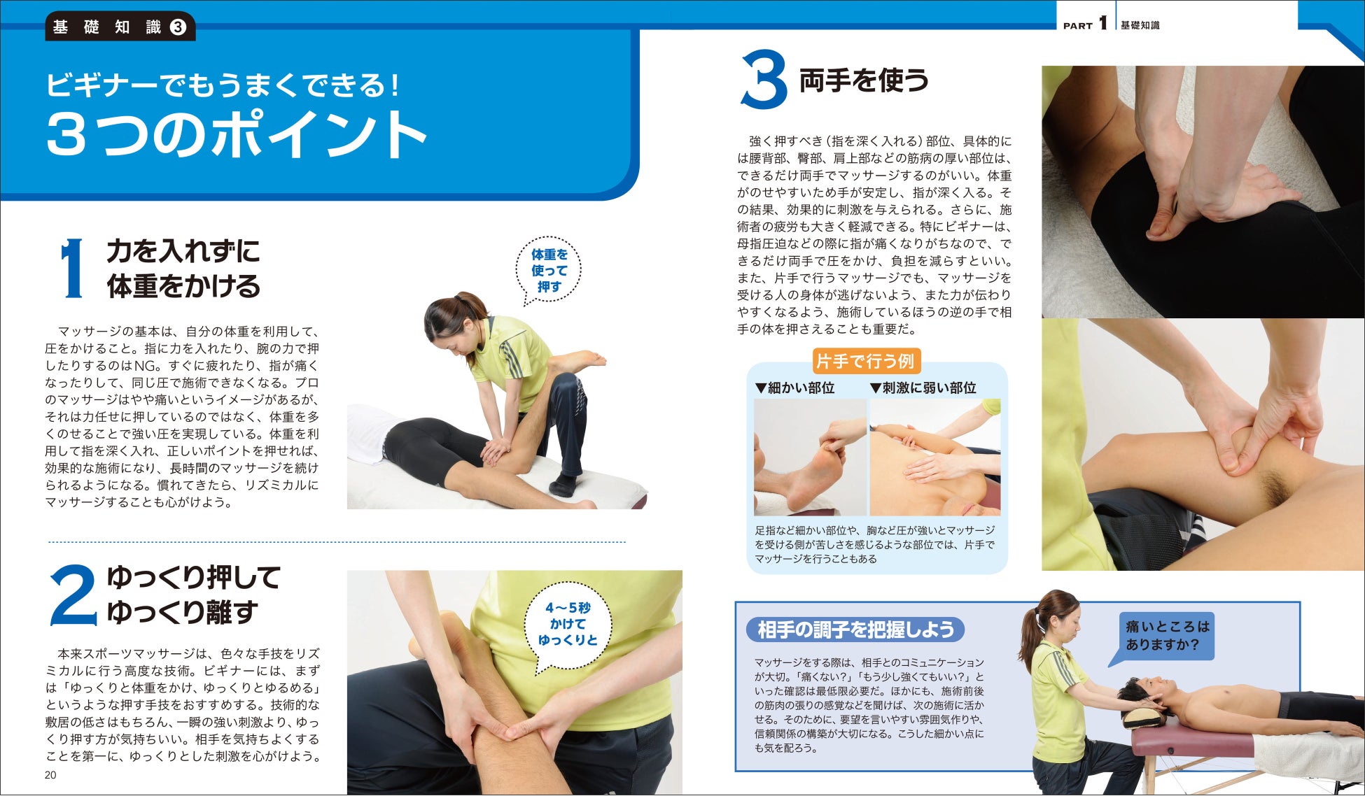 ▲競技ごとに、負荷のかかりやすい部位などの特性を考慮した種目別マッサージも豊富に紹介。疲労の軽減や障害予防の効果を高めます