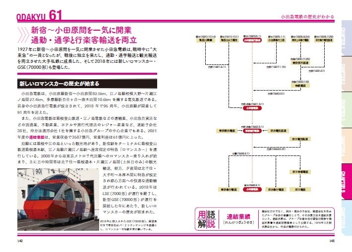 1927年に現在の小田原線にあたる新宿~小田原間を一気に開業した小田原急行鉄道にはじまり、観光用急行の台頭、ロマンスカーの登場や近年の複々線化など、小田急の発展のあゆみを解説します。