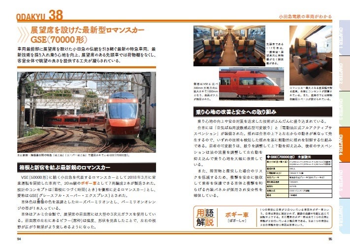 フラッグシップトレインである特急ロマンスカーの車両や、2020年にデビューした5000形をはじめとした現役車両を紹介。歴代の名車も分類して解説しています。