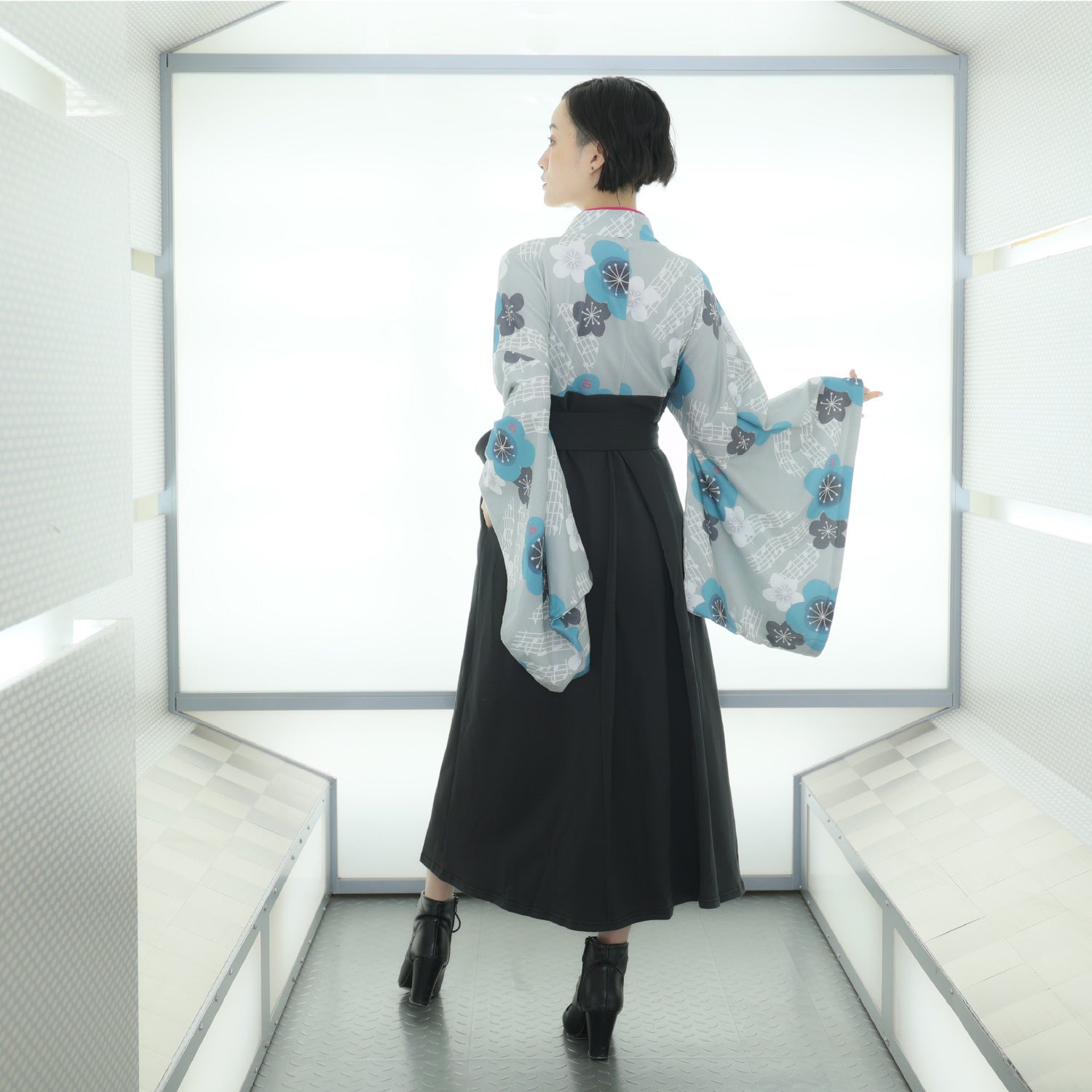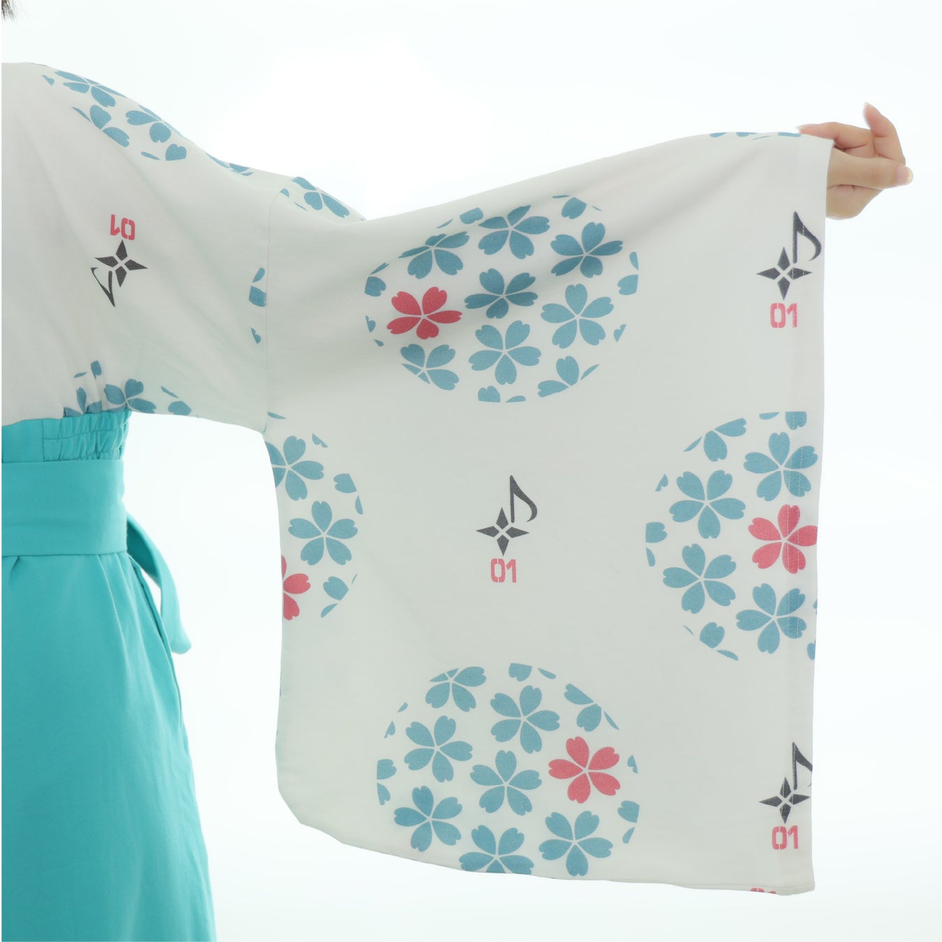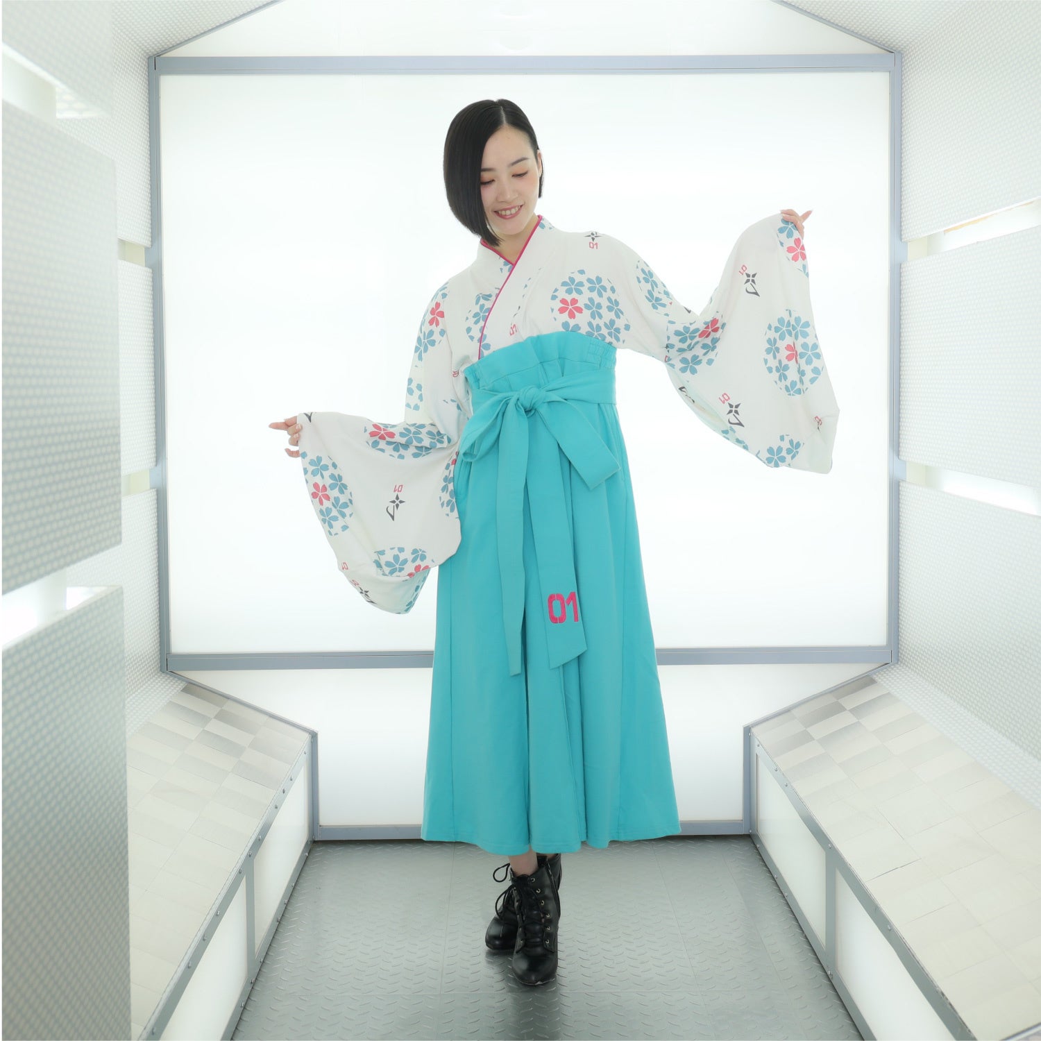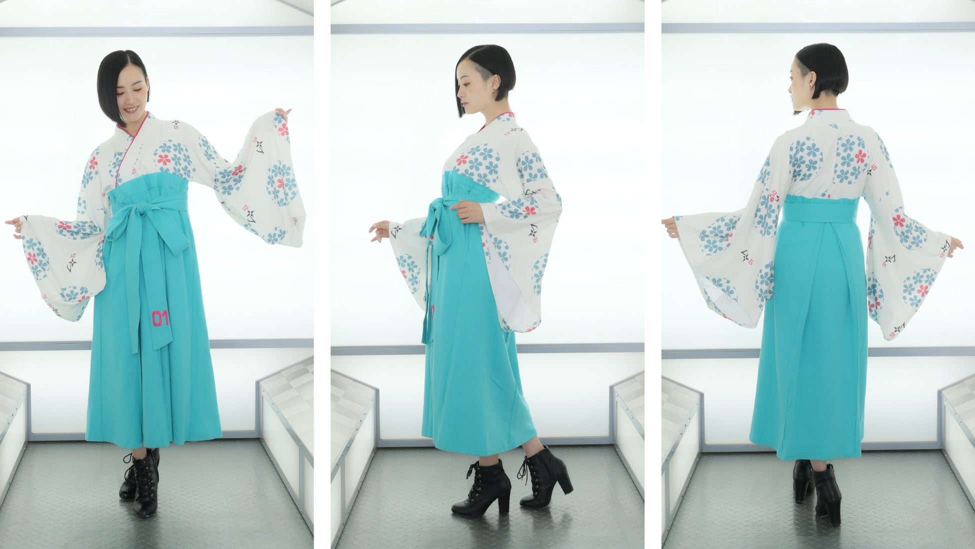 和の文化である桜とバーチャルシンガーの初音ミクから着想を得た音符がデザインされた袴です。