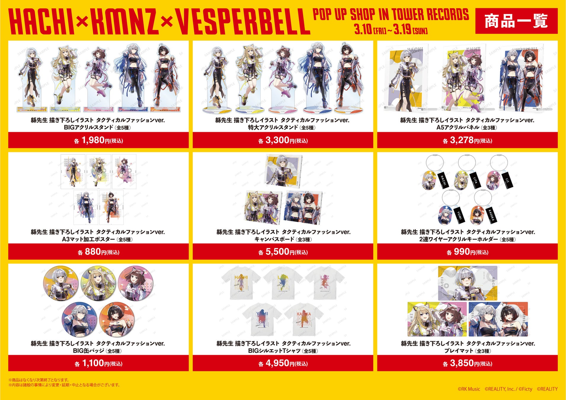 タワーレコード一部店舗にて、「HACHI×KMNZ×VESPERBELL POP UP SHOP in TOWER RECORDS」を開催いたします。