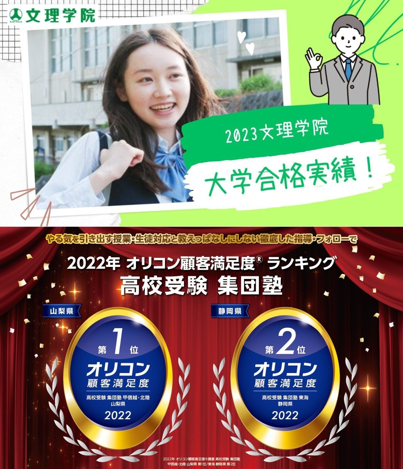 【文理学院(山梨・静岡)】オリコン顧客満足度調査Ⓡランキング高校受験集団塾 山梨県1位・静岡県2位の文理学院が2023年度大学合格実績を発表!