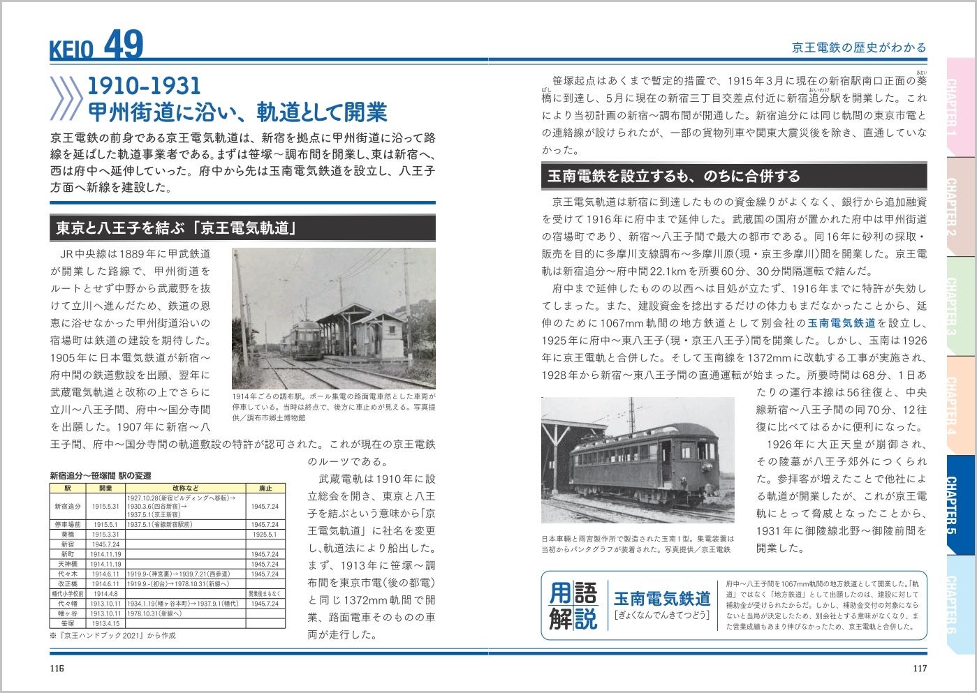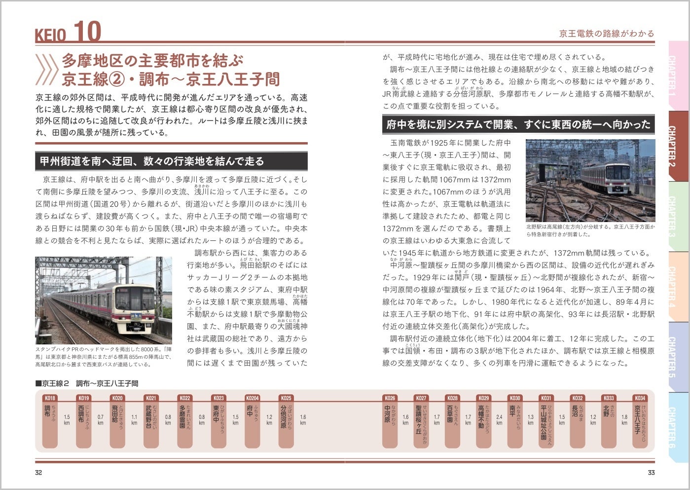 京王電鉄には、新宿を拠点に多摩地域を結ぶ京王線系統(京王線、高尾線、相模原線、競馬場線、動物園線の5路線)、そして渋谷と吉祥寺を結ぶ井の頭線の計6路線があります。第2章では、その全路線を解説し、全駅名・駅間距離を掲載しています。