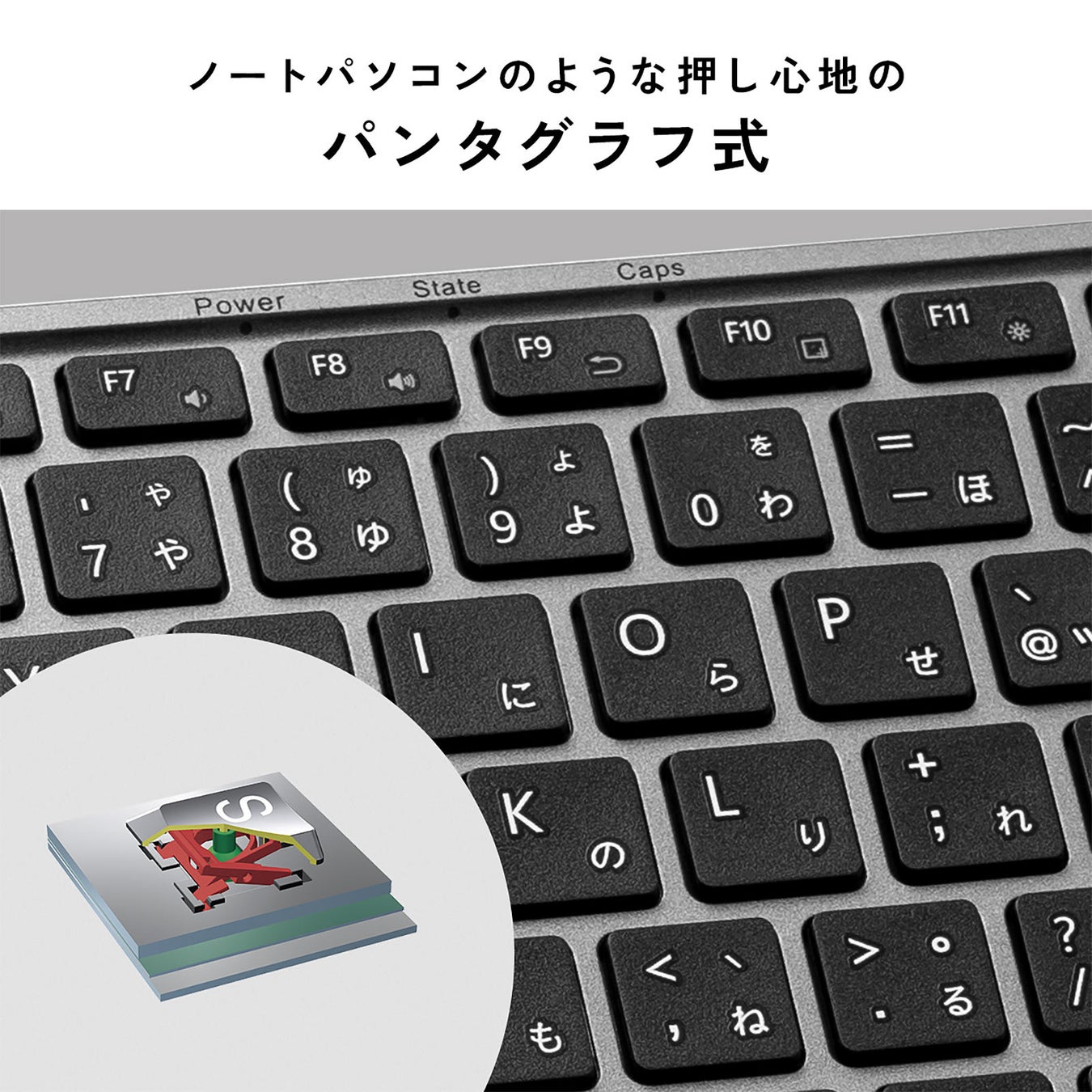 パンタグラフキー方式を採用。キーピッチは一般的なフルキーボードと同じ19mm。違和感を感じにくくストレスフリーな入力を実現します。
