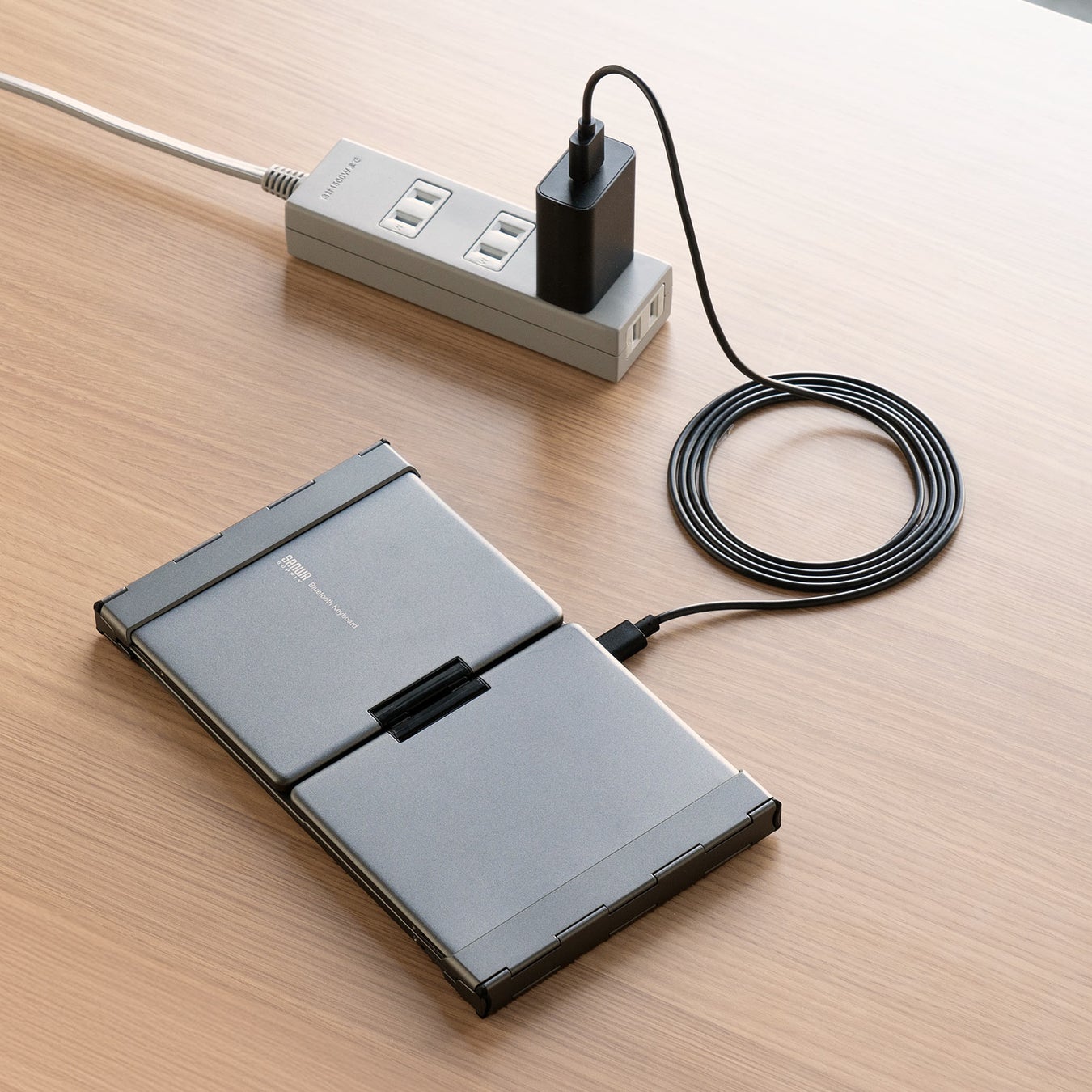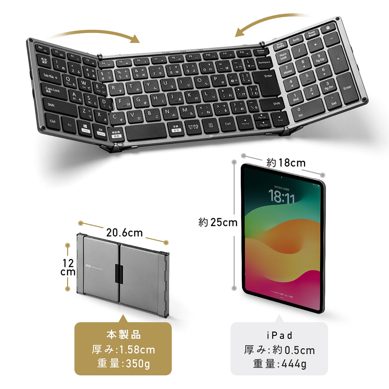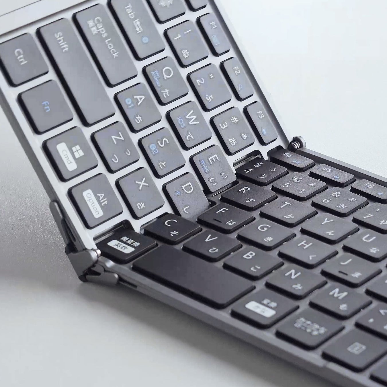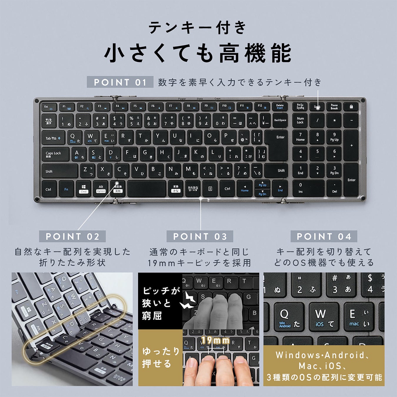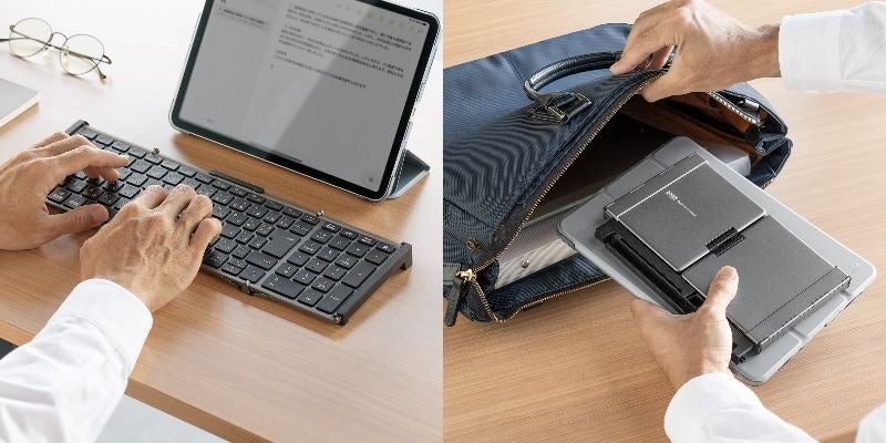 三つに折りたたむことで、テンキー付きのフルキーボードをコンパクトに収納できます。持ち運びに便利で外出先でも快適な作業が可能です。