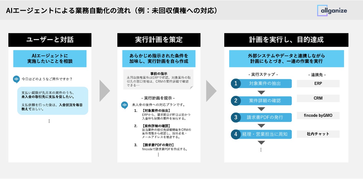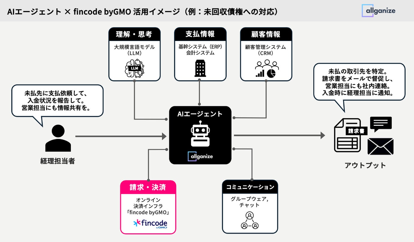 このたび、「fincode byGMO」は、Allganizeが提供する「Alli LLM App Market」の自律型AIエージェントをノーコードで作成できるツール「Agent Builder」と連携し、「Agent Builder」を活用して構築されたAIエージェントを通じて決済や請求、データ処理といった業務の自動化・高度化を実現します。