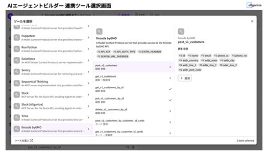 Allganizeが提供する生成AI・LLMプラットフォーム「Alli LLM App Market」内の「Agent Builder」にて、「fincode byGMO」との連携を指定できます。MCPを介して「fincode byGMO」の環境と接続することで、「Alli LLM App Market」のユーザー企業は、自社のAIエージェントを通じて決済用リンクの発行や請求書の発行をはじめとする決済関連の操作や、「fincode byGMO」へのデータ登録・出力などが可能となり、決済関連業務の自動化・高度化が実現します。