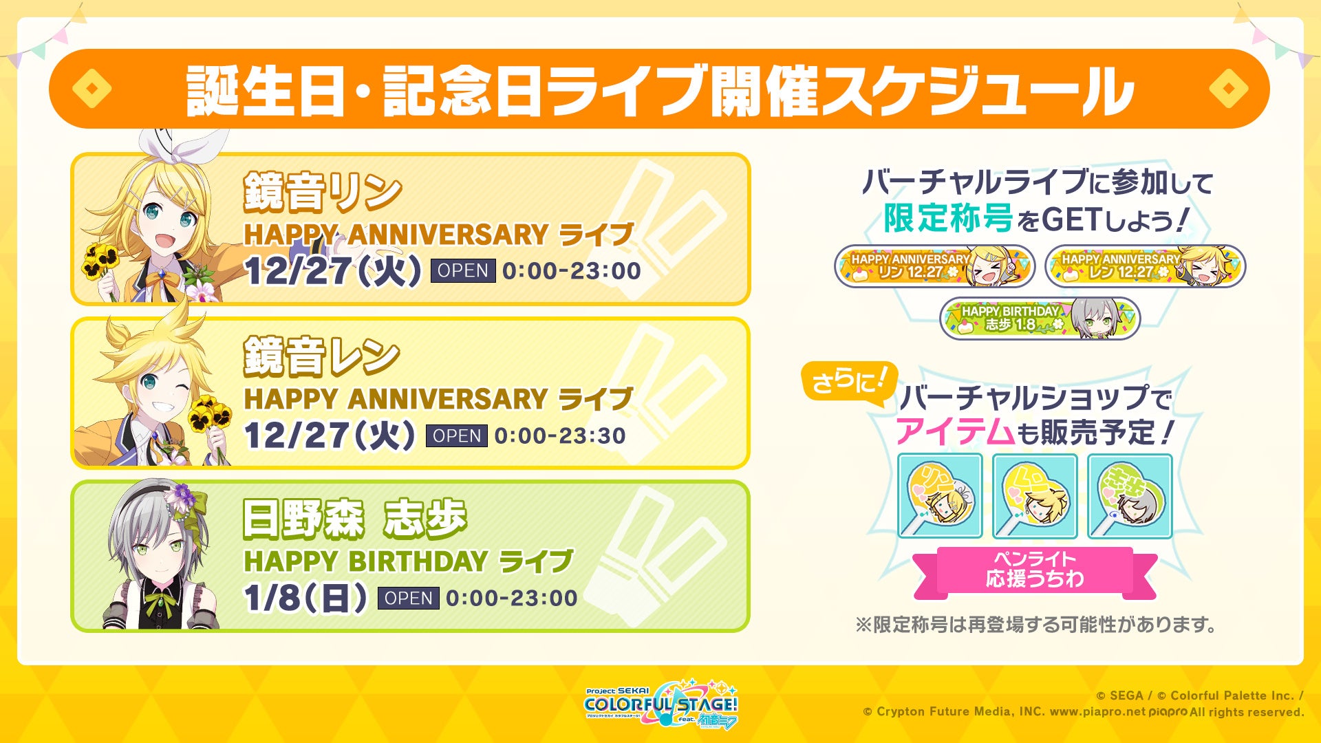 ■鏡音リン、鏡音レン、日野森志歩の記念日・誕生日ライブ開催決定!