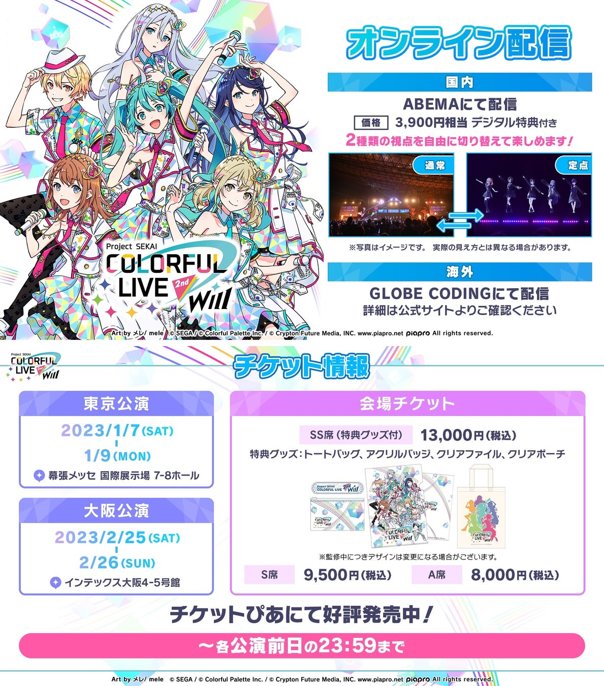 それぞれ、詳細は「プロジェクトセカイ COLORFUL LIVE 2nd- Will -」公式サイト(https://pjsekai.sega.jp/colorfullive/2nd-will/index.html)および、公式Twitter(https://twitter.com/pjsekai_live)でご確認ください。