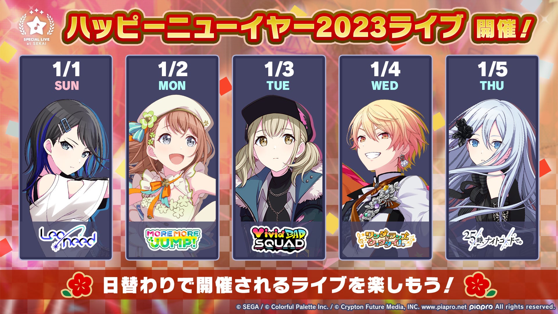 「ハッピーニューイヤー2023ライブ」では、日替わりで各ユニットのバーチャルライブが開催されます。参加報酬として各ライブ「想いのカケラ」×100個がもらえるほか、新年を記念したアイテムなども販売されます。