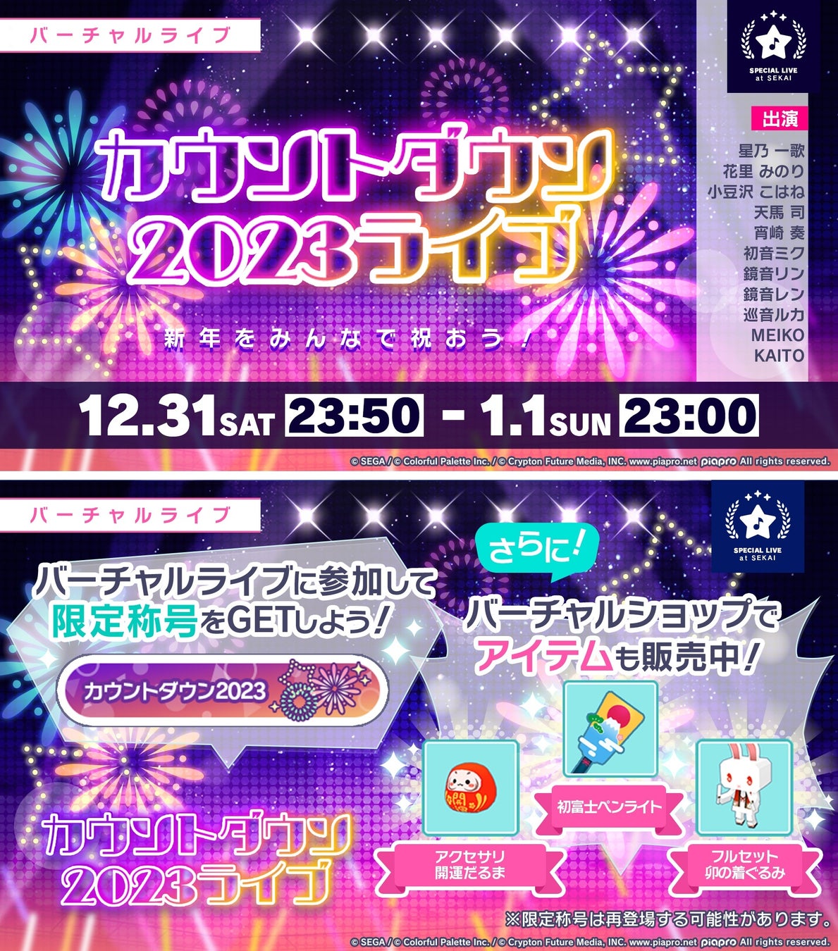 また、「カウントダウン2023ライブ」の開催に先立ち、12月31日(土)15:00よりバーチャルショップにて、アクセサリ「開運だるま」、「初富士ペンライト」、フルセット「卯の着ぐるみ」などを販売いたします。