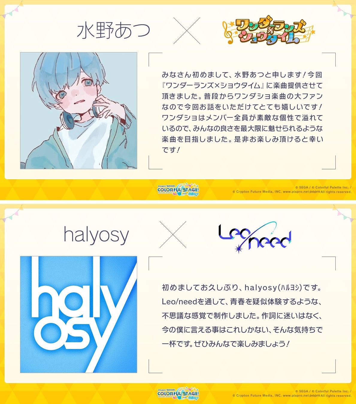 水野あつさんには「ワンダーランズ×ショウタイム」のユニット楽曲、halyosyさんには「Leo/need」のユニット楽曲を提供いただきます。