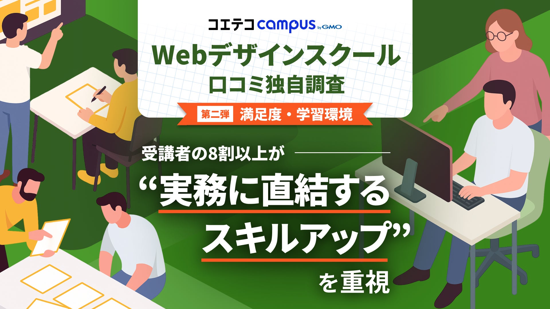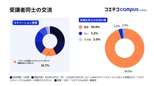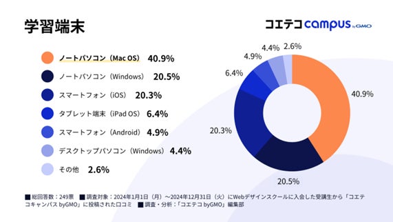 GMOインターネットグループのGMOメディア株式会社(代表取締役社長:森 輝幸 以下、GMOメディア)が運営するプログラミング・Webデザインスクール検索サイト「コエテコキャンパス byGMO」(URL:https://coeteco.jp/campus)は、2024年1月1日(月)から2024年12月31日(火)までの期間にWebデザインスクールへ入会した受講者249名を対象に、満足度や学習環境に関する口コミ調査を実施しました。