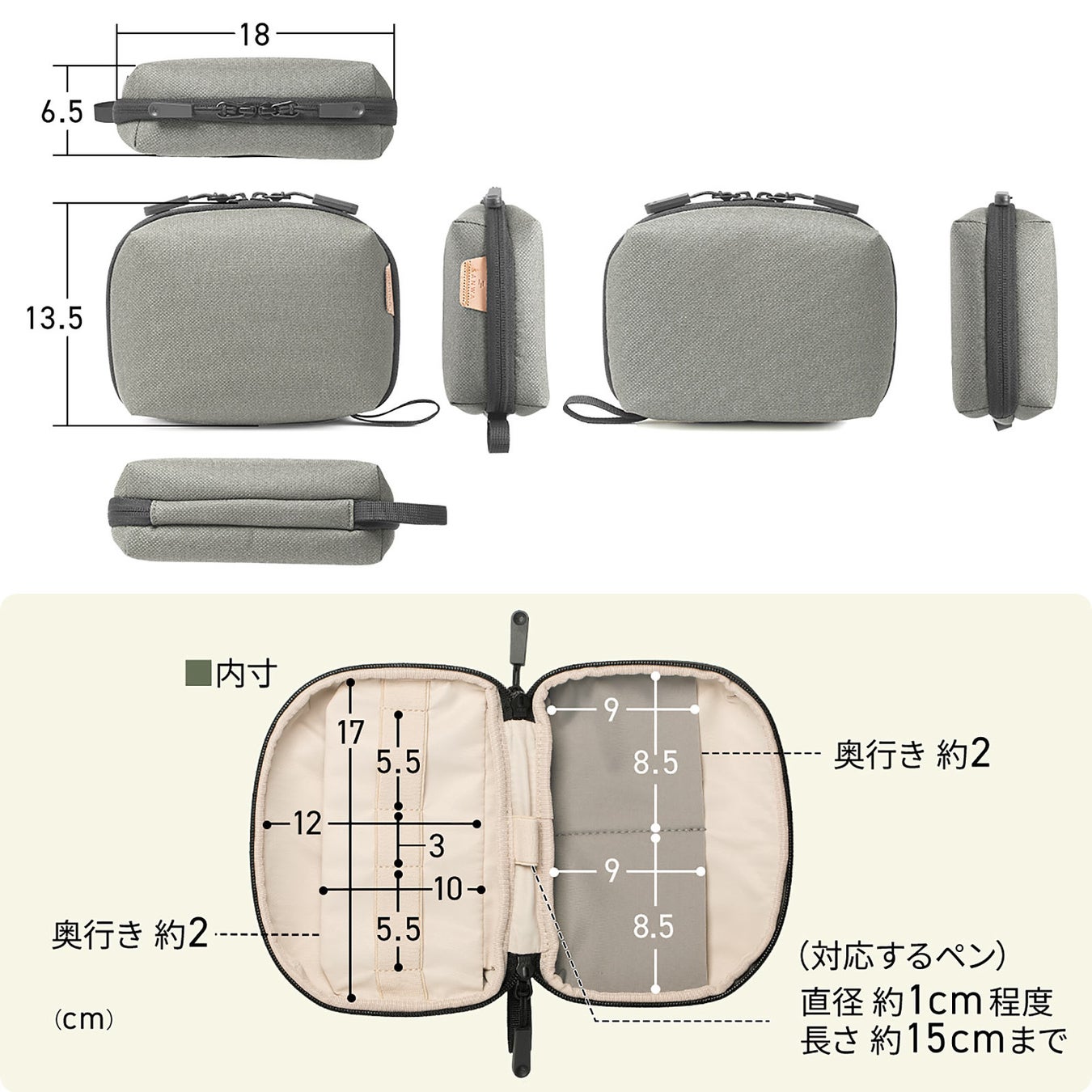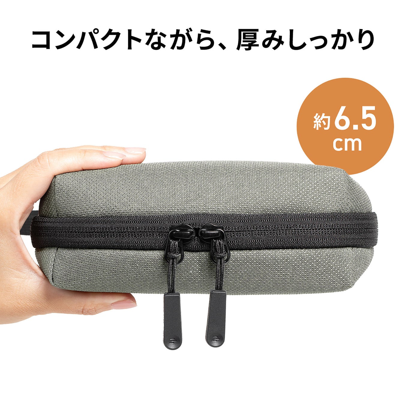 マチは約6cmあり、厚みのあるものも収納可能です。コンパクトながらも収納力抜群のため、充電器やケーブル、イヤホンなどを一つにまとめて持ち運ぶことができます。