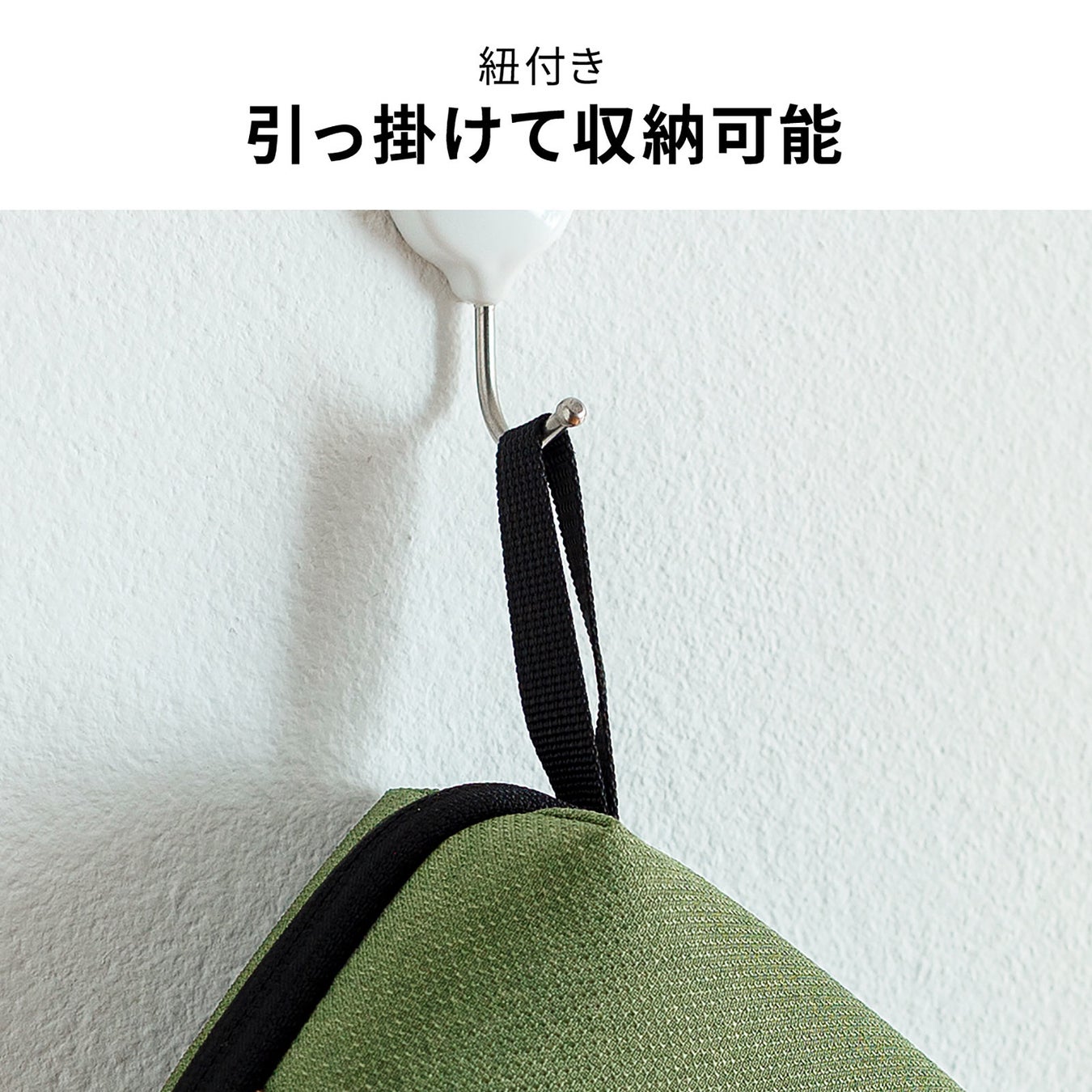 ダブルファスナーを採用しているため、左右どちらからでも開けやすくなっています。さらに、紐付きで引っ掛けて収納できるため、使わない時も場所を取らずに保管できます。