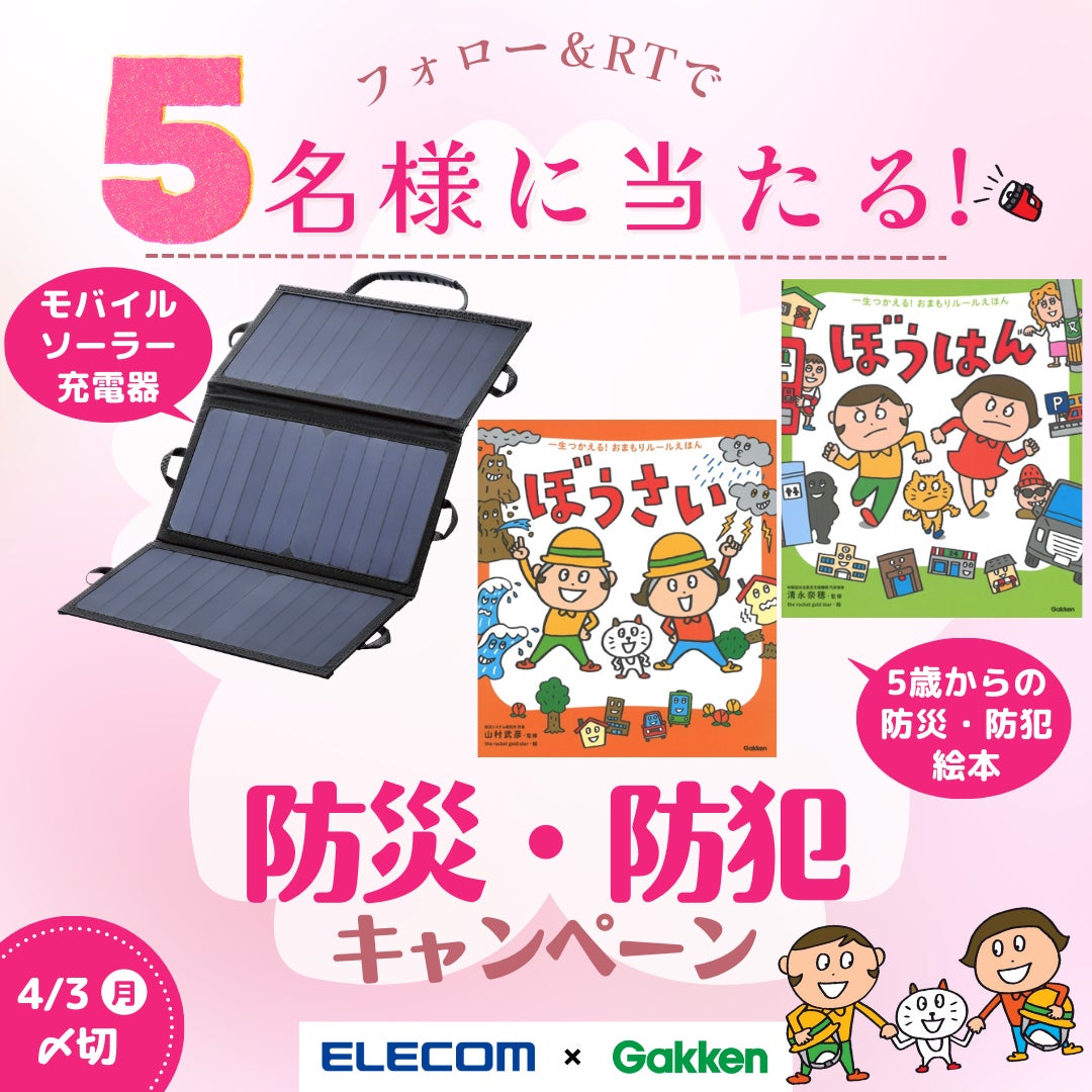 【エレコム×Gakken】モバイルソーラー充電器と防災・防犯絵本2冊のセットがあたる! Twitterキャンペーンを開催中