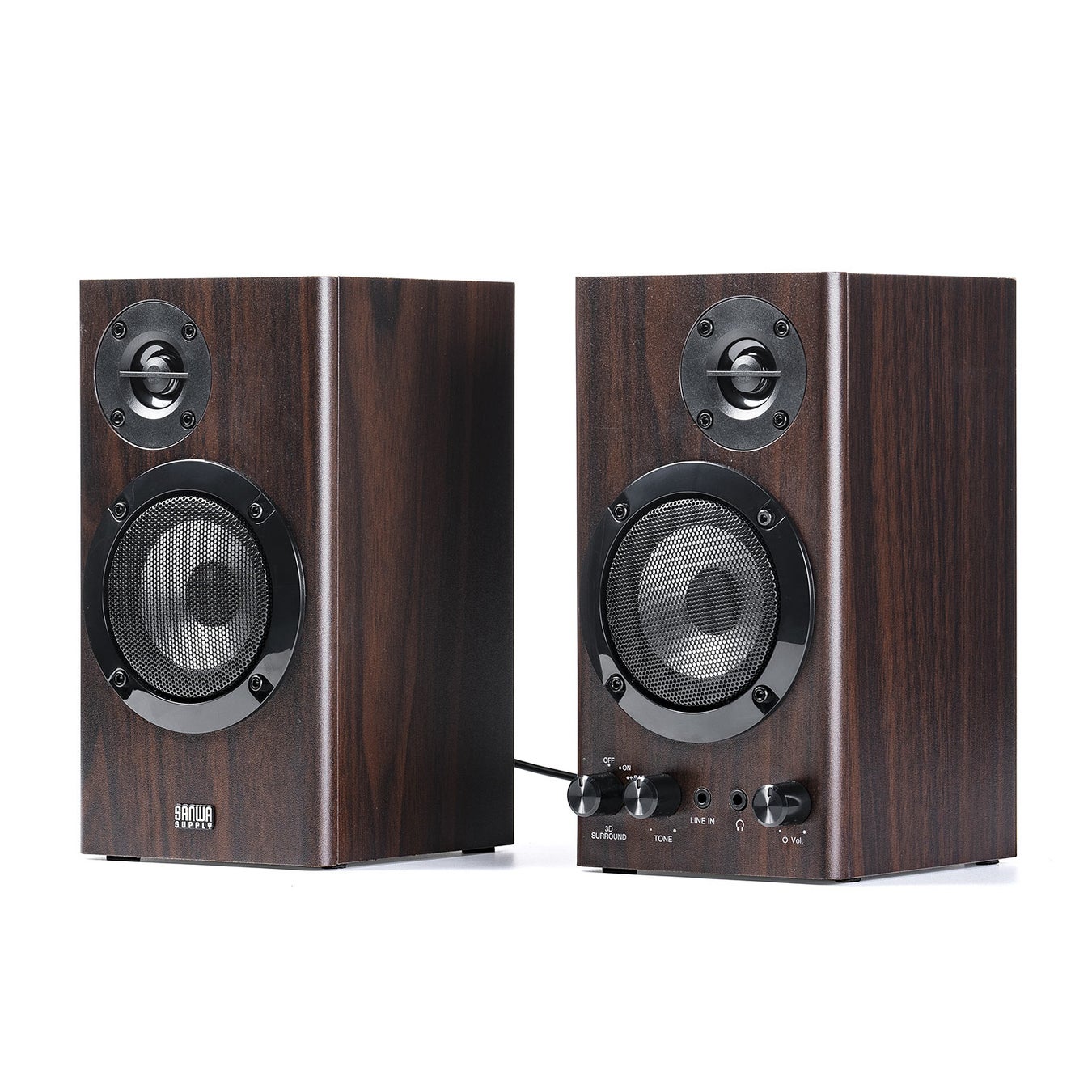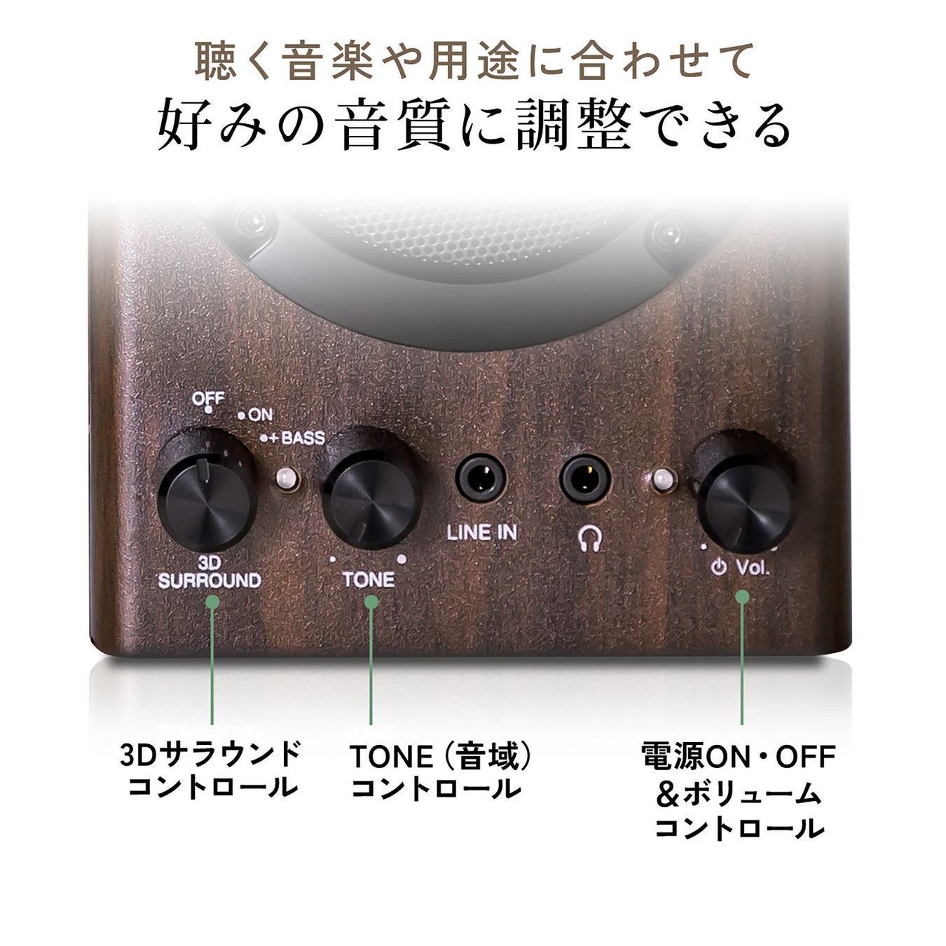 箱鳴りを抑えながら迫力のある重低音の再現が可能な木製キャビネットを採用した、合計60W出力と3Dサラウンド機能を搭載したPCスピーカー