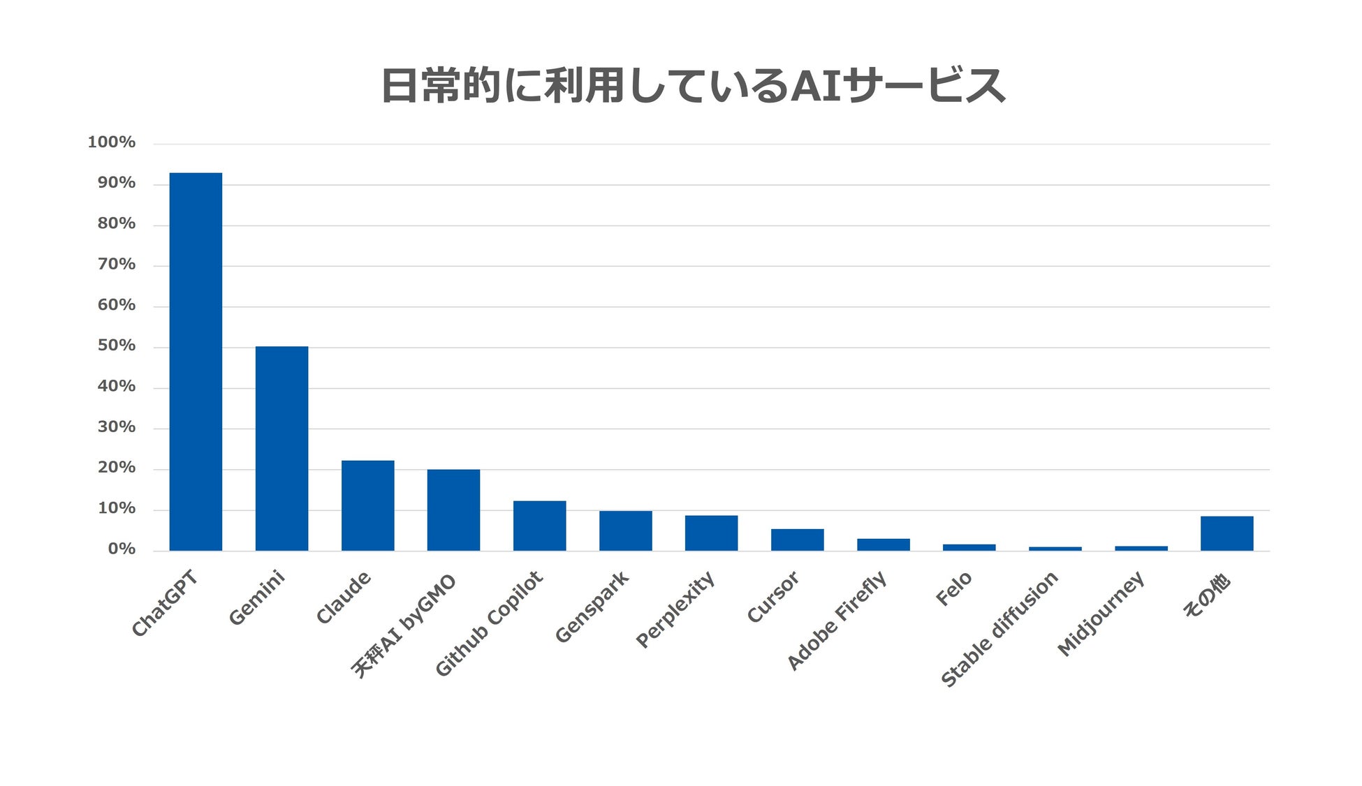 ・ 業務活用をしているパートナーのうち、日常的に利用している生成AIサービスは、ChatGPTが93.0%と一番多く、次いでGemini(50.3%)、Claude(22.2%)、天秤AI byGMO(20.0%)となりました。Geminiが前回の30.9%から大幅に伸び、また天秤AI byGMOはClaudeと同じ程度使われていることが分かりました。