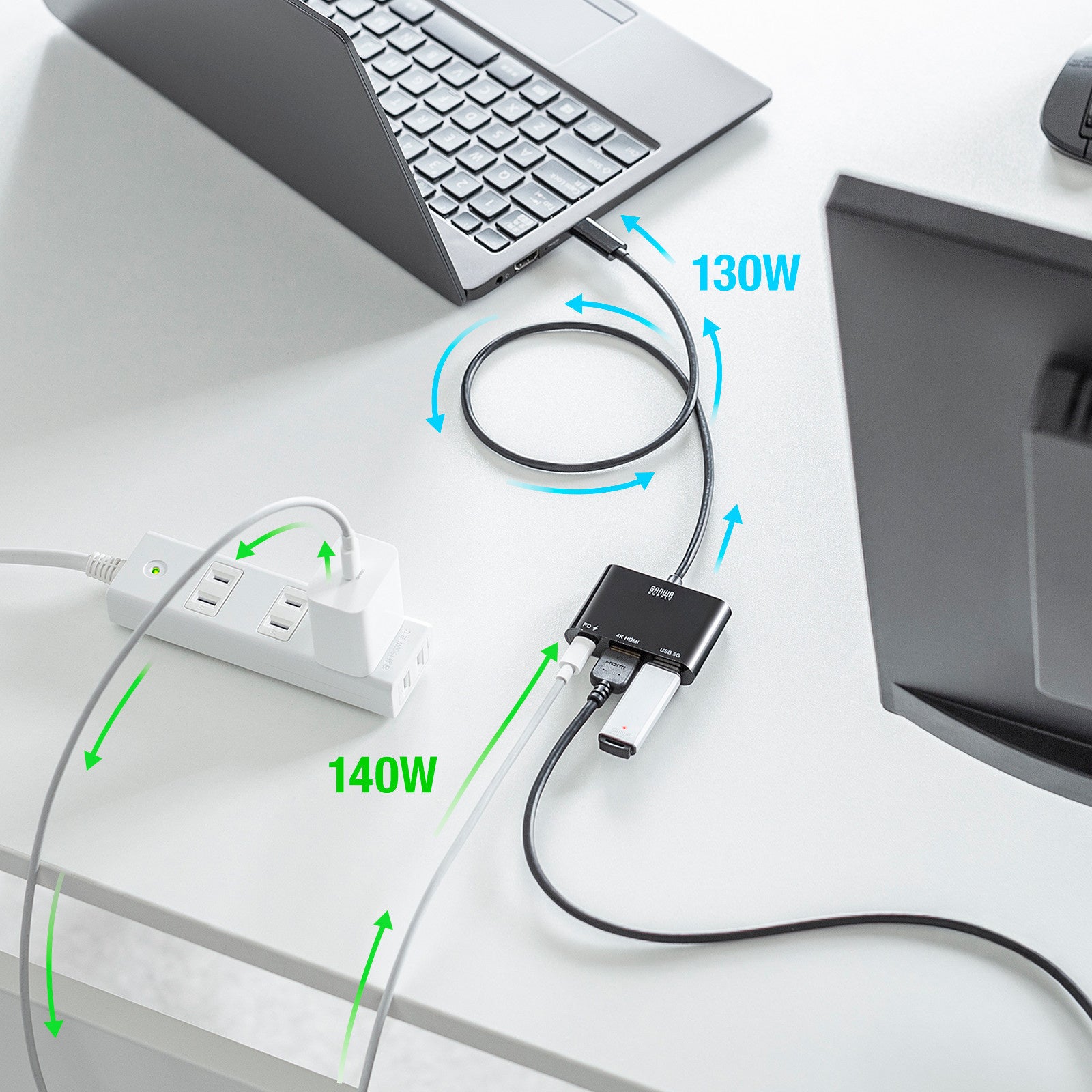 別売のPD給電対応アダプタを接続すれば、本製品経由でパソコン本体に充電しながら映像出力が可能です。