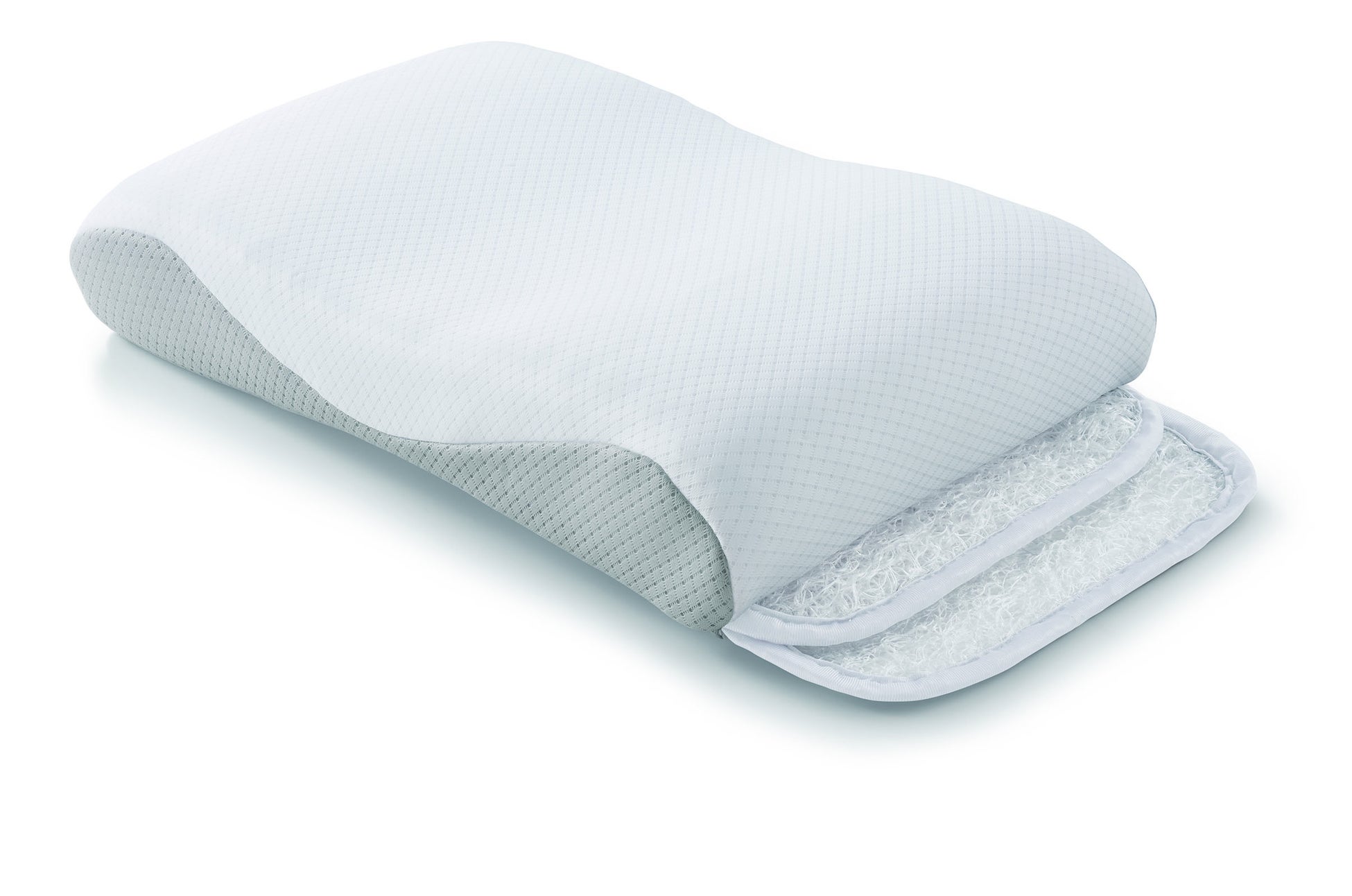 通気性が良い中材を使用しています。2枚のシートを付け外しすることで簡単に高さ調節ができるほか、くぼみ部分に頭がフィットし、首や肩への負担を軽減します。また、両端を高くした形状で、横向き寝もしやすい仕様です。中材、高さ調節シートともに水洗いができ、カバーは洗濯機で洗うことができます。