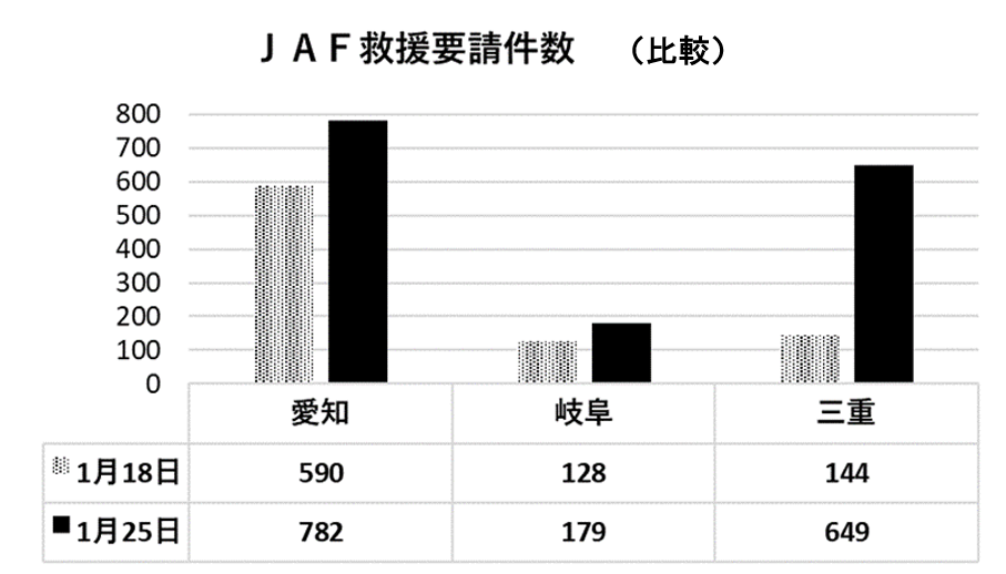 寒波の影響で急激に冷え込んだ今年の1月25日(水)、愛知県でも最高気温2.7℃、最低気温-3.8℃を記録し、JAF愛知支部には782件の救援要請がありました。また、この日は三重県でも降雪があり東海3県の合計は1,610件で、前の週の18日(水)と比較して約1.9倍に増加しました。
