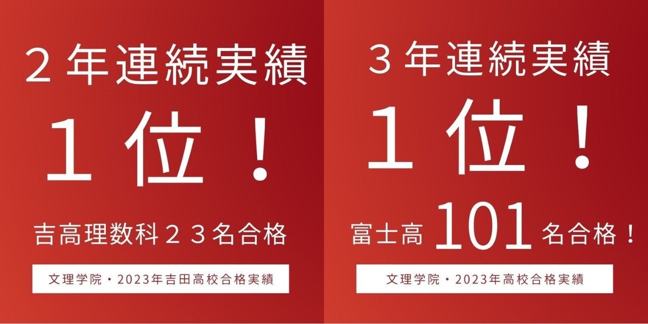 文理学院は2023年度山梨・静岡の高校合格実績を発表しました。山梨県立吉田高校理数科23名合格、静岡県立富士高校101名合格でともに合格実績地域№1となりました。