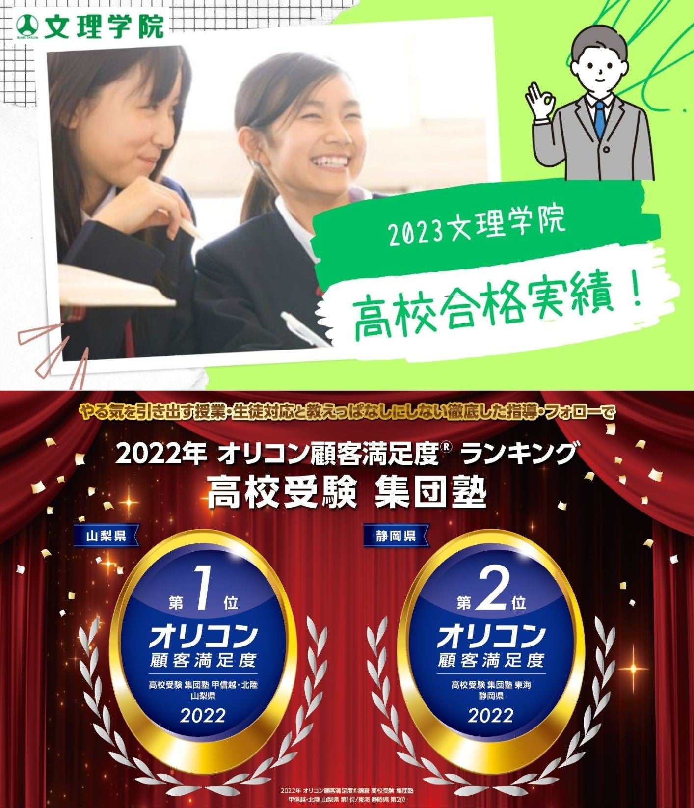 【文理学院(山梨・静岡)】オリコン顧客満足度調査Ⓡ高校受験集団塾山梨県1位、静岡県2位の文理学院が、2023年度山梨・静岡の高校合格実績(3/19付)を発表しました。