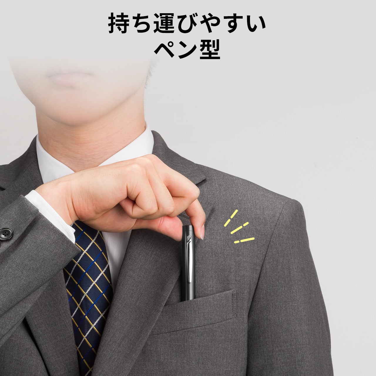 ●ポケットからサッと取り出せるペン型タイプ、しかもクリップ付きで、胸ポケットに入れ手軽に持ち運ぶことができます。