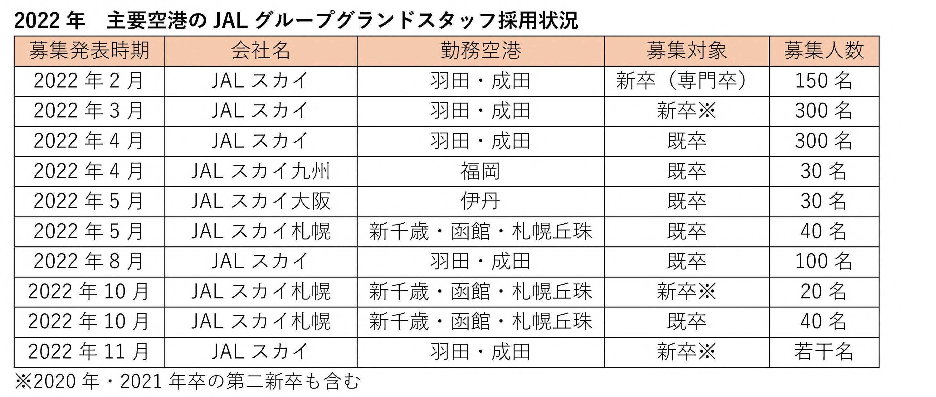 JALグループのグランドスタッフの採用人数は下表の通りです。