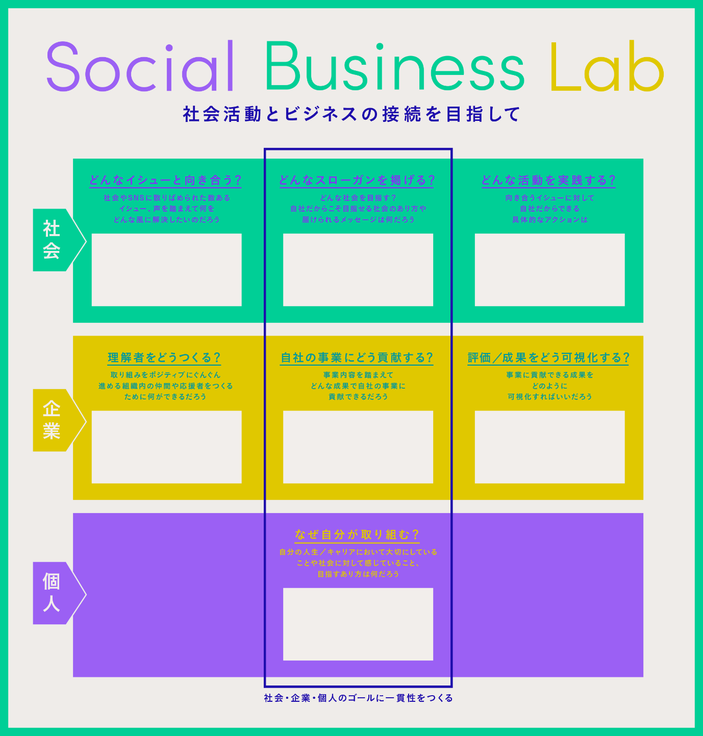 事業貢献するソーシャルアクションのノウハウ、視点を「Social Action Canvas」として可視化し公開していきます。社会、企業、個人の視点でビジネスと共存するアクションのポイントとなる7つの項目を設定。それぞれの項目のTipsやノウハウを事例やワークショップごとに可視化することで、ソーシャルアクションとビジネスの共存に取り組む方たちの支援につながることを目指しています。