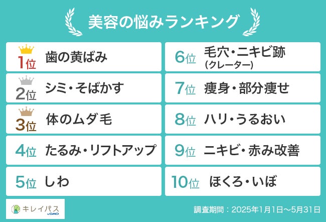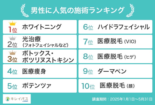 GMOインターネットグループのGMOビューティー株式会社(本社:東京都渋谷区、代表取締役社長:高橋 良輔)が運営する、美容医療の検索・予約サービス「キレイパス byGMO」(https://kireipass.jp/)は、同サービスの利用者のデータに基づき、「2025年上半期 美容医療人気ランキング」を発表いたします。