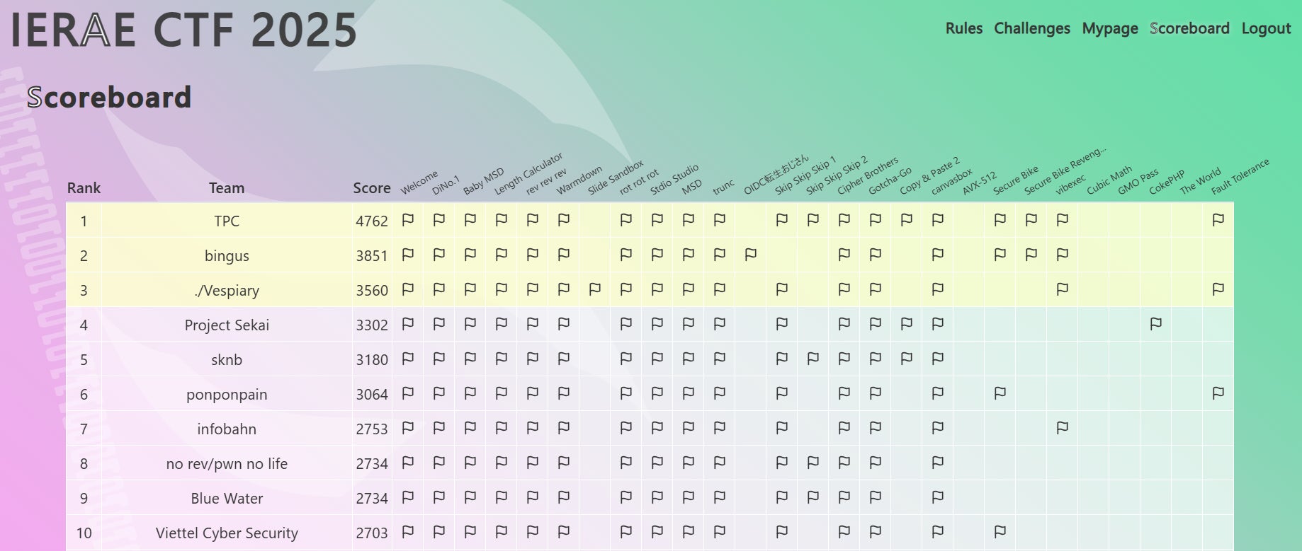 今年が2回目の開催となる「IERAE CTF」でしたが、大きなトラブルもなく、好評のうちに終了することができました。本大会では、「初心者に門戸を開き、最高峰にも競い合う場を」というコンセプトを掲げ、弊社を誇るCTFトッププレイヤー総出で問題を作成しています。結果として、幅広い層にご参加いただけました。特に日本人の、あまりCTFに馴染みがない方々から、「楽しめた」というフィードバックをいただけたのは嬉しい限りです。また、日本の学生1位のチームである「TPC」が、全体でも1位を獲得するという素晴らしい結果に衝撃を覚えると同時に、日本の若手プレイヤーへの期待を膨らませています。今後も、CTFコミュニティへの還元を目的とし、このような場を提供していきます。