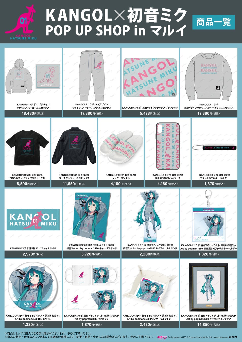 今回のイベントでは、イラストレーターのpopman3580さんによる、『初音ミク』とファッションブランド『KANGOL』がコラボした新規描き下ろしイラストを使用したグッズを多数先行販売する他、お買上げ抽選会などの実施を予定しております。