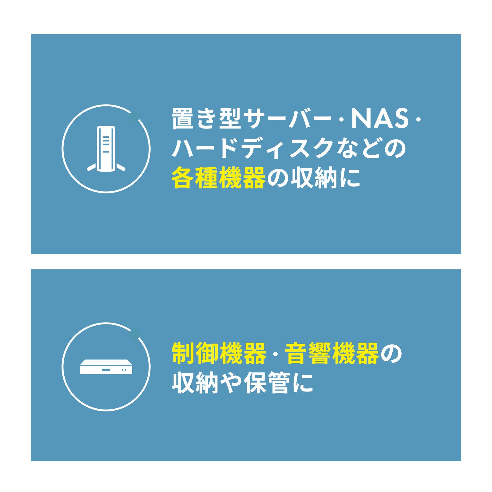 NAS・ハードディスク・ルーター・LANハブなどの小型機器の収納だけでなく、置き型サーバー、機械の制御機器、音響機器などを収納できます。