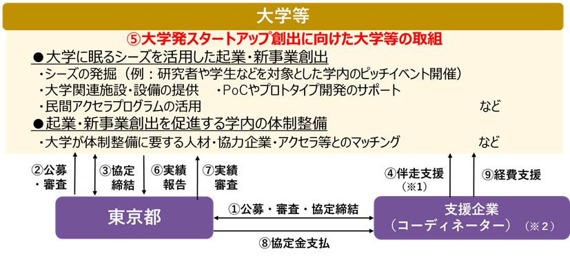 東京都とコーディネーター(株式会社キャンパスクリエイト)が連携し、大学発スタートアップの創出に向けた大学等の各種取組(シーズの事業化や学内の体制整備等)に対して、伴走支援及び経費支援を行います。