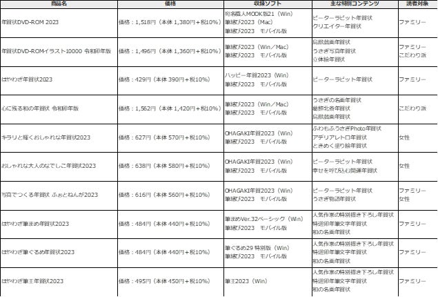 手間と時間をかけずに年賀状を送りたい方に向けたお手軽年賀状も多数そろえています。いずれも豊富な素材や特典、市販年賀状ソフトの特別版が収録されて、税別500円以下という価格でラインナップ。忙しい年末を時短で乗り切りたい方におすすめです。