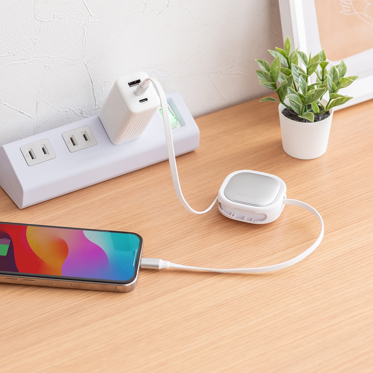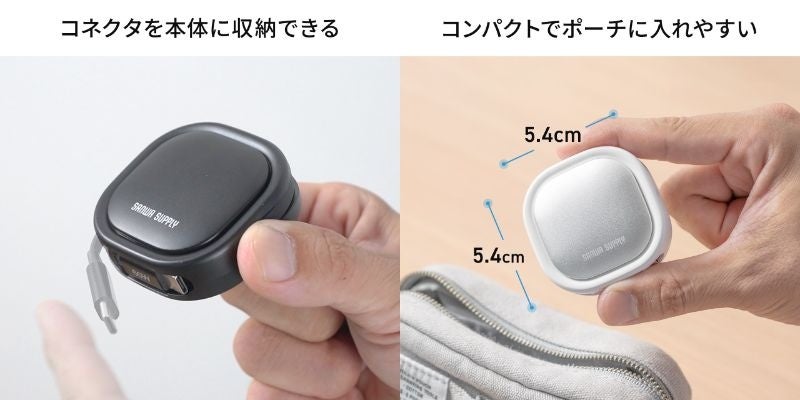 この巻き取り式USB Type-Cケーブルは、コネクタ部分も本体に収納できるため、バッグの中でのかさばりません。出張や旅行の際にも、コンパクトに持ち運びができます。