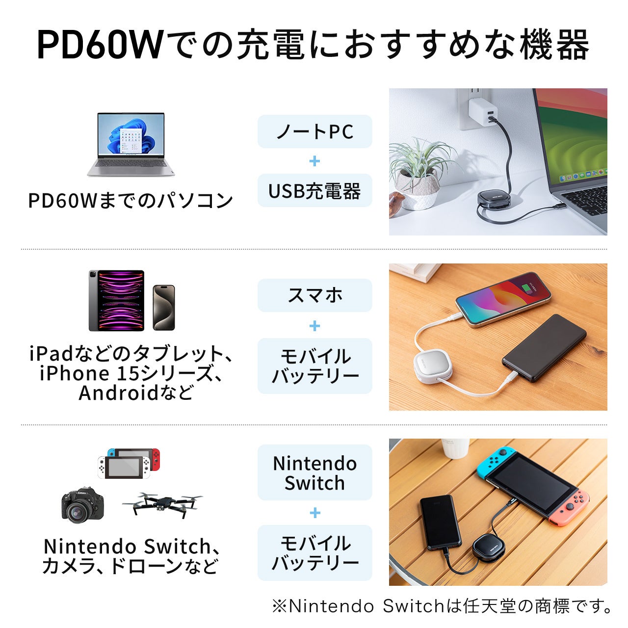 巻き取り式 USB Type-Cケーブル 両引き CtoC 1.2m PD60W 充電ケーブル データ転送 持ち運び iPad iPhone スマホ タブレット