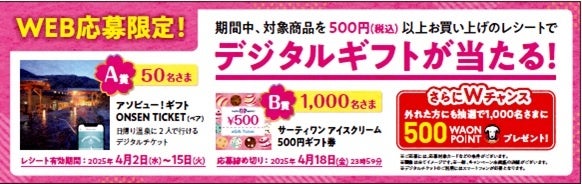 また、より一層お客さまにフェアを楽しんでいただくために、総計2,050名さまに「日帰り温泉」や「サーティワンアイスクリーム ギフト券」等が当たる景品企画もご用意しフェアを盛り上げます。
