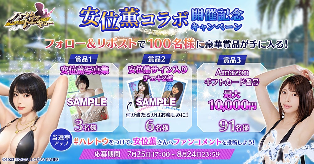 人気セクシー女優の安位薫さんとのコラボレーションを記念して、抽選で合計100名様にゲーム内に登場する衣装を着用したサイン入りチェキや、最大10,000円のAmazonギフトカード番号が当たるキャンペーンを実施致します。