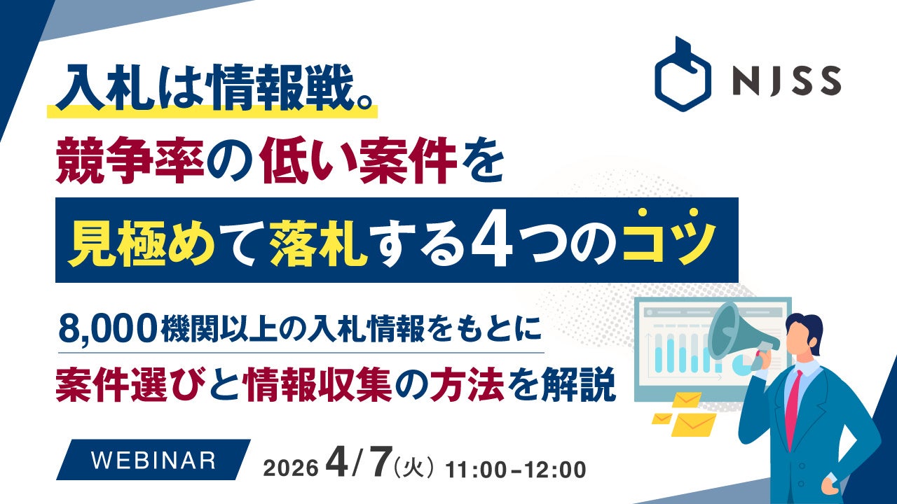 本セミナーでは、入札情報速報サービス「NJSS(エヌジェス)」を提供するうるるが、データをもとに入札市場の特徴を解説しながら、競争率の低い案件を見極めるための考え方や情報収集の方法をご紹介します。発注機関ごとの案件傾向や、見落とされやすい案件の特徴など、案件選びの視点を整理しながら解説します。さらに、NJSSの実際の検索・分析画面を用いたデモンストレーションも行い、入札情報をどのように収集し、案件選びに活用していくのかを具体的にご覧いただきます。入札市場の基本を理解したい方や、これから入札への参加を広げていきたい企業の方におすすめの内容です。